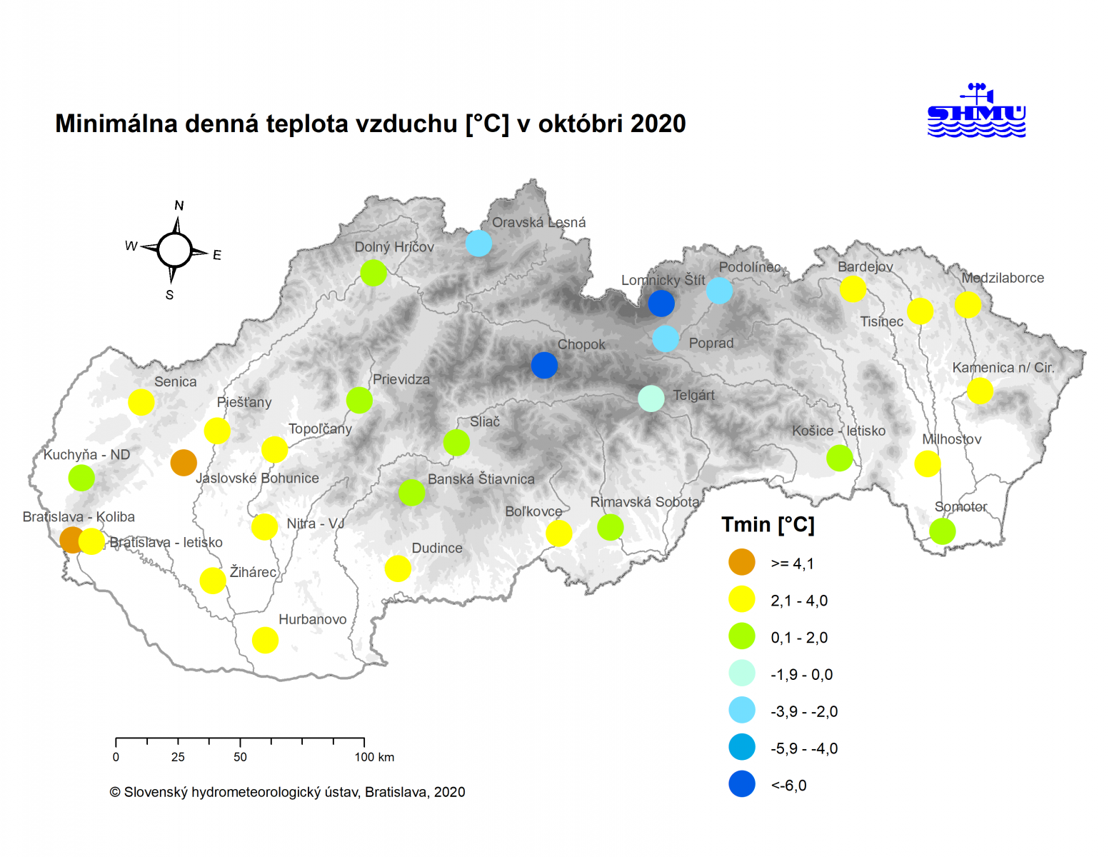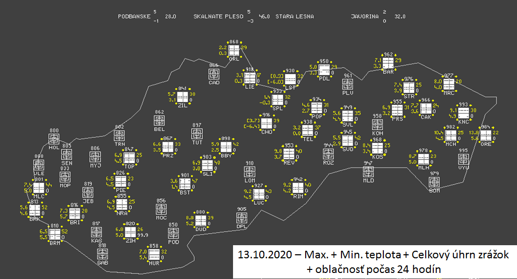 Absolútne najnižšia teplota v rámci polôh do 1000 m nad morom bola pozorovaná dňa 20.10. v Oravskej Polhore. Namerali tu -3,4°C.
