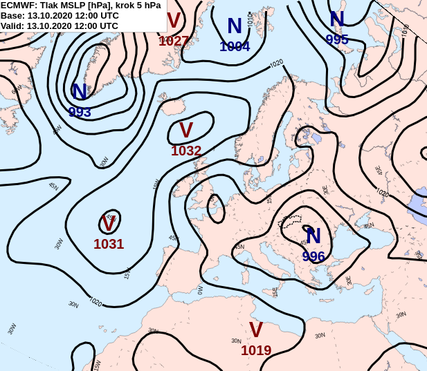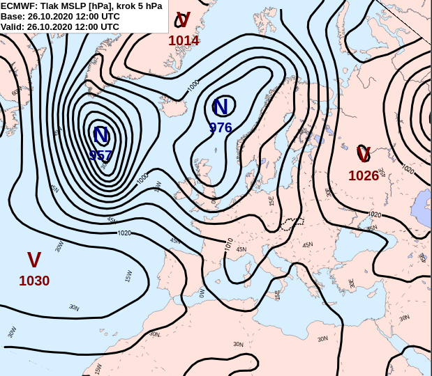Od 24.10. až do záveru mesiaca nad severnou polovicou Európy prevládala veľmi rozsiahla oblasť nízkeho tlaku vzduchu a nad južnou + juhovýchodnou časťou kontinentu sa po väčšinu tohto obdobia udržiaval relatívne vyšší tlak vzduchu. Slovensko bolo striedavo pod vplyvom jedného alebo druhého tlakového útvaru.