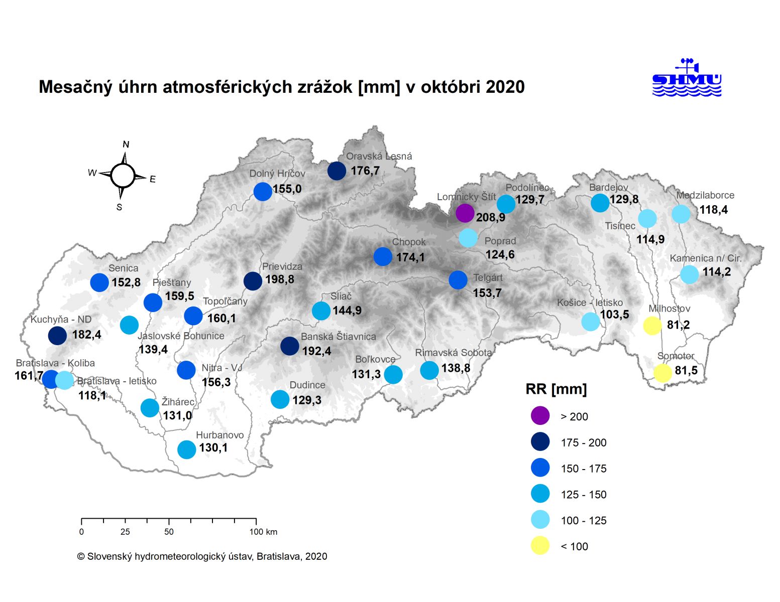 Počas októbra spadlo na väčšine územia 100 až 160 mm zrážok, pričom rozhodujúce zrážkové úhrny sme pozorovali v období od 10.10. do 17.10. Ešte vyššie mesačné úhrny boli napríklad v Oravskej Lesnej (177 mm), v Kuchyni (182 mm) a na Lomnickom štíte (209 mm).