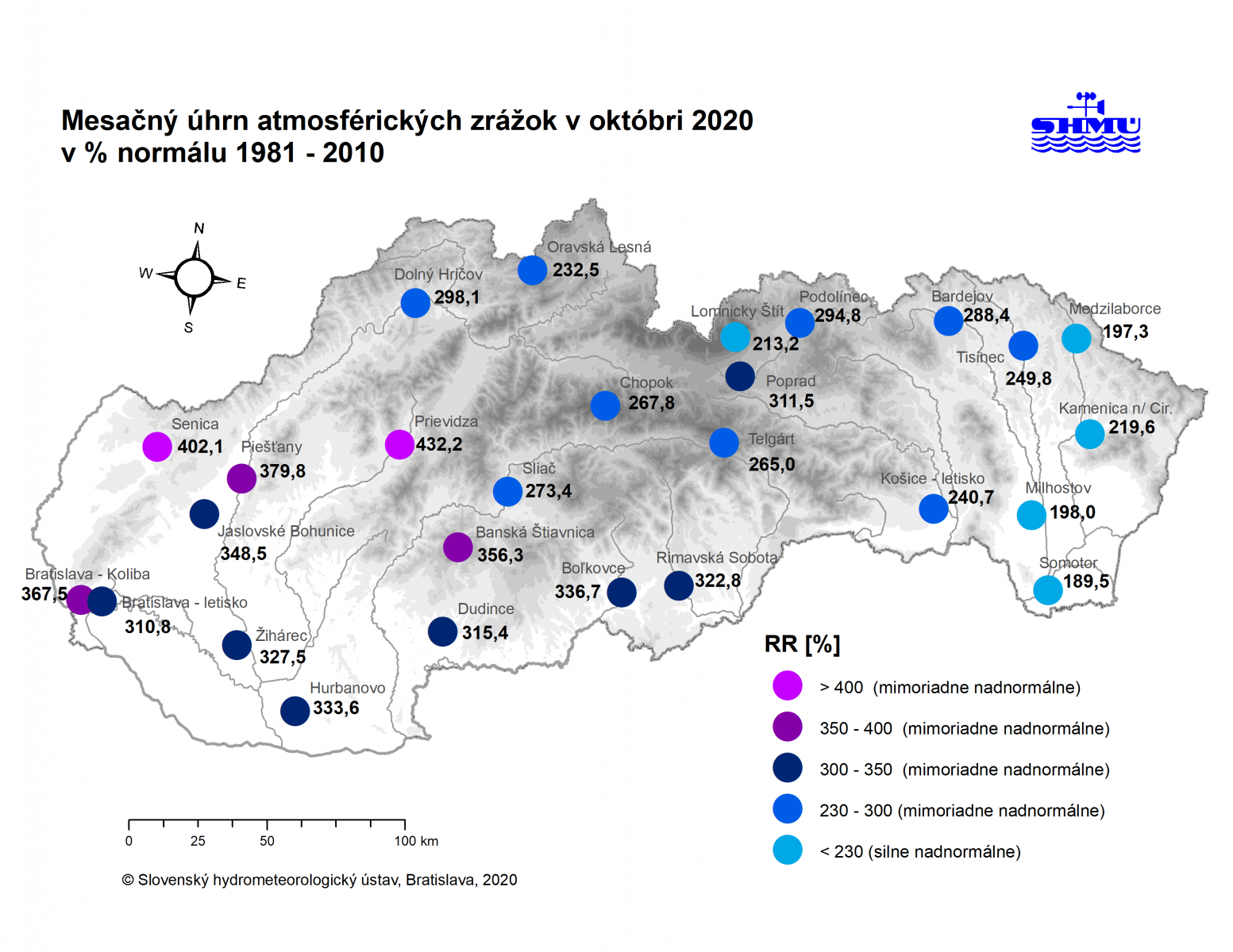 Z vyššie uvedeného vyplýva, že mesiac ako celok skončil na Slovensku silne až mimoriadne zrážkovo nadnormálny. Napríklad v Senici spadlo zaokrúhlene 402 % a v Prievidzi zaokrúhlene až 432 % normálového úhrnu 1981-2010. O tom, že október bol na niektorých miestach naozaj mimoriadne bohatý na zrážkový úhrn svedčí aj fakt, že v Piešťanoch a na Chopku bol zaznamenaný najvyšší októbrový mesačný úhrn zrážok minimálne od roku 1961.