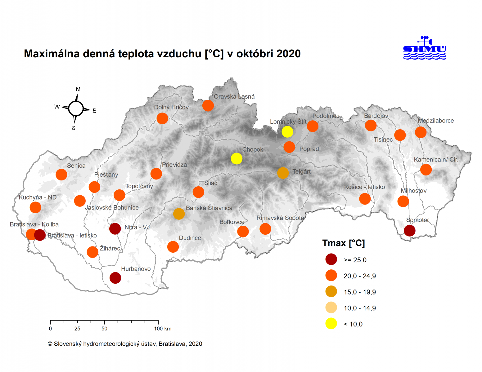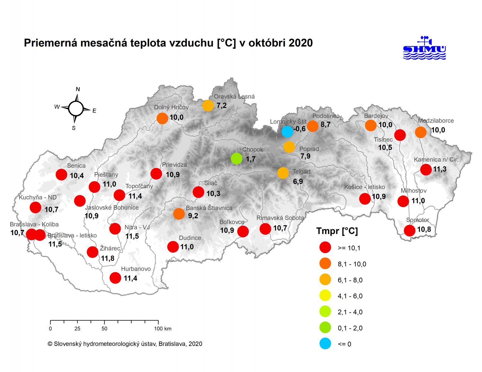 Znamená to, že mesiac skončil ako celok väčšinou teplotne nadnormálny s odchýlkou +1,1 až +2,0°C od normálu 1981-2010. Na dané pomery bol október relatívne chladnejší na juhozápade a napríklad na staniciach Bratislava Koliba, Kuchyňa a Hurbanovo skončil mesiac ako celok teplotne normálny s odchýlkou +0,4 až +0,8°C. Naopak, na hornom Zemplíne bol október teplotne silne nadnormálny s odchýlkou viac ako +2,0°C od normálu.