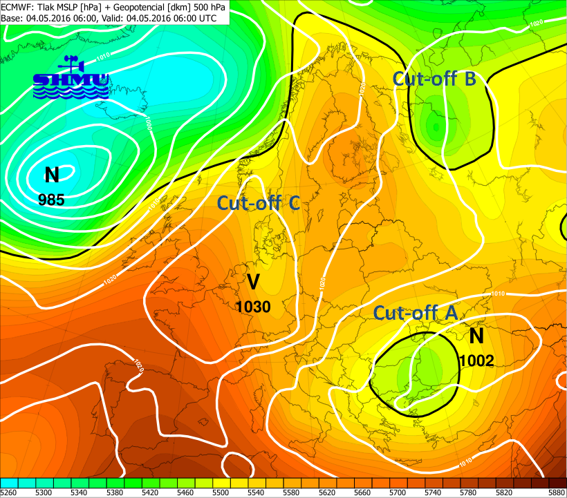 Obr. 1 - Analýza prízemného tlakového poľa (biele izočiary) a geopotenciálu hladiny 500 hPa (farebná škála) 4.5.2016 06:00 UTC z modelu ECMWF. Písmená označujú výškové tlakové níže v hladine 500 hPa (ang. cut-off/cut-off low).