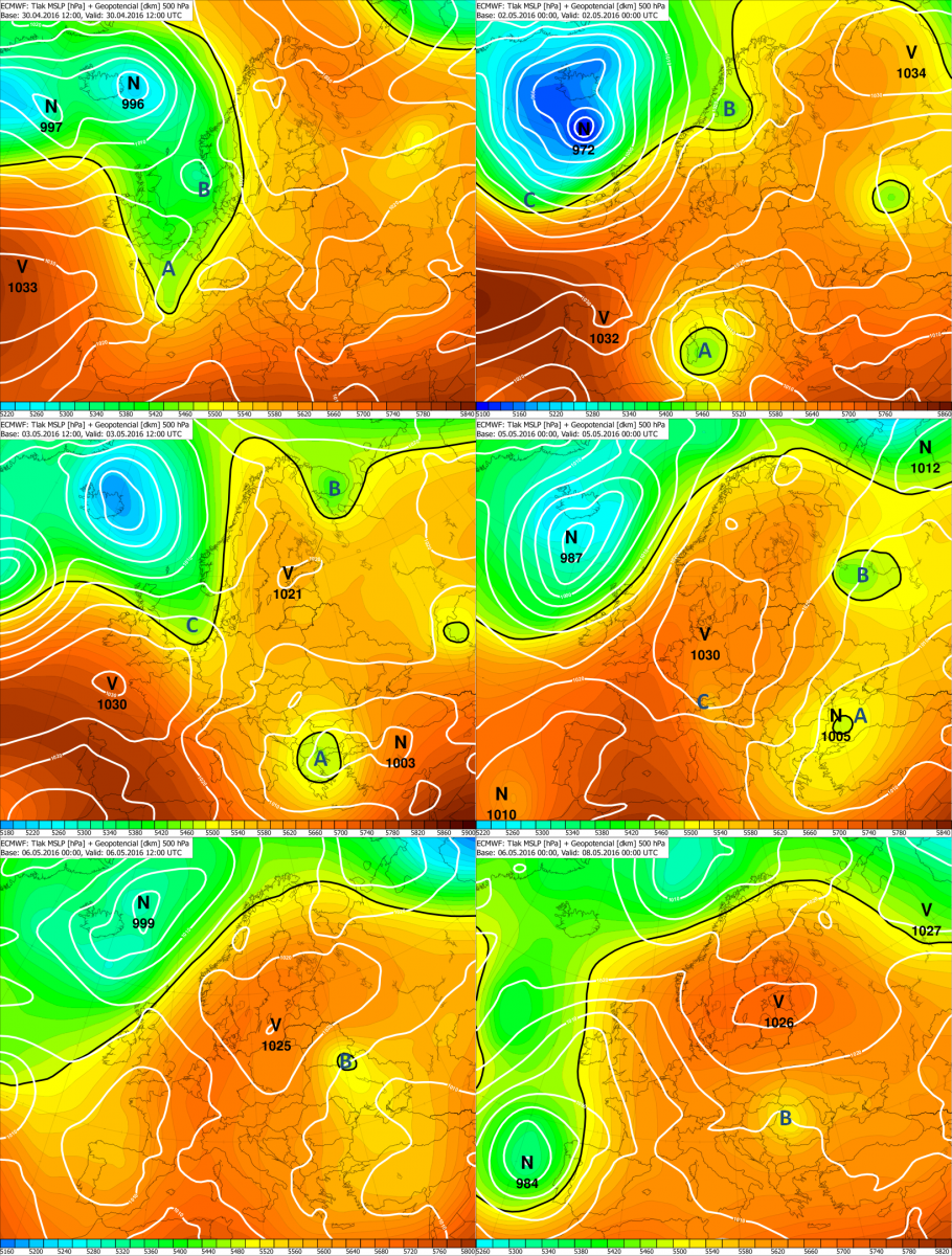 Obr. 2 - Analýzy a predpoveď prízemného tlakového poľa (biele izočiary) a geopotenciálu hladiny 500 hPa (farebná škála) z modelu ECMWF od 30.4. do 8.5.2016, krok 36 hodín. Písmená A, B , C označujú výškové tlakové níže, resp. brázdy v úvodnej fáze.