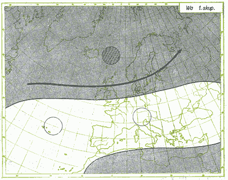 2. Druhá skupina Wa je charakterizovaná pohyblivou cyklónou. V priebehu obdobia sa presúva z okolia Islandu cez Nórske more do severnej časti Škandinávie, Fínska a nad polostrov Kola. Oblasť vysokého tlaku zostáva nad celou južnou polovicou Európy, anticyklonálny stred sa vysúva z Azorských ostrovov nad Francúzsko.
