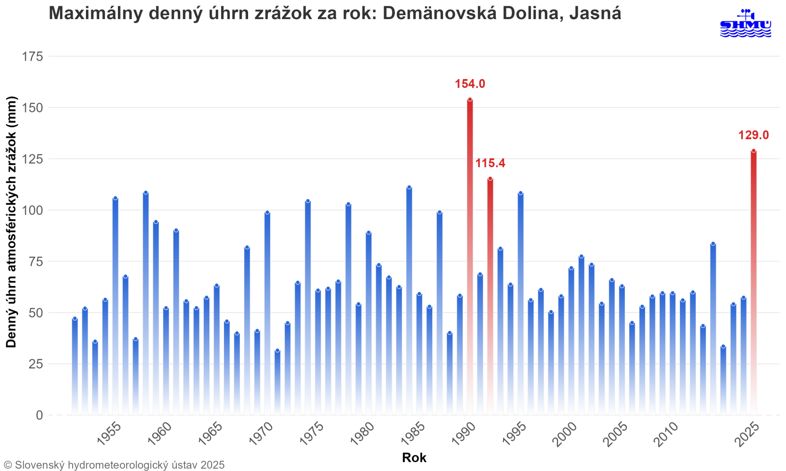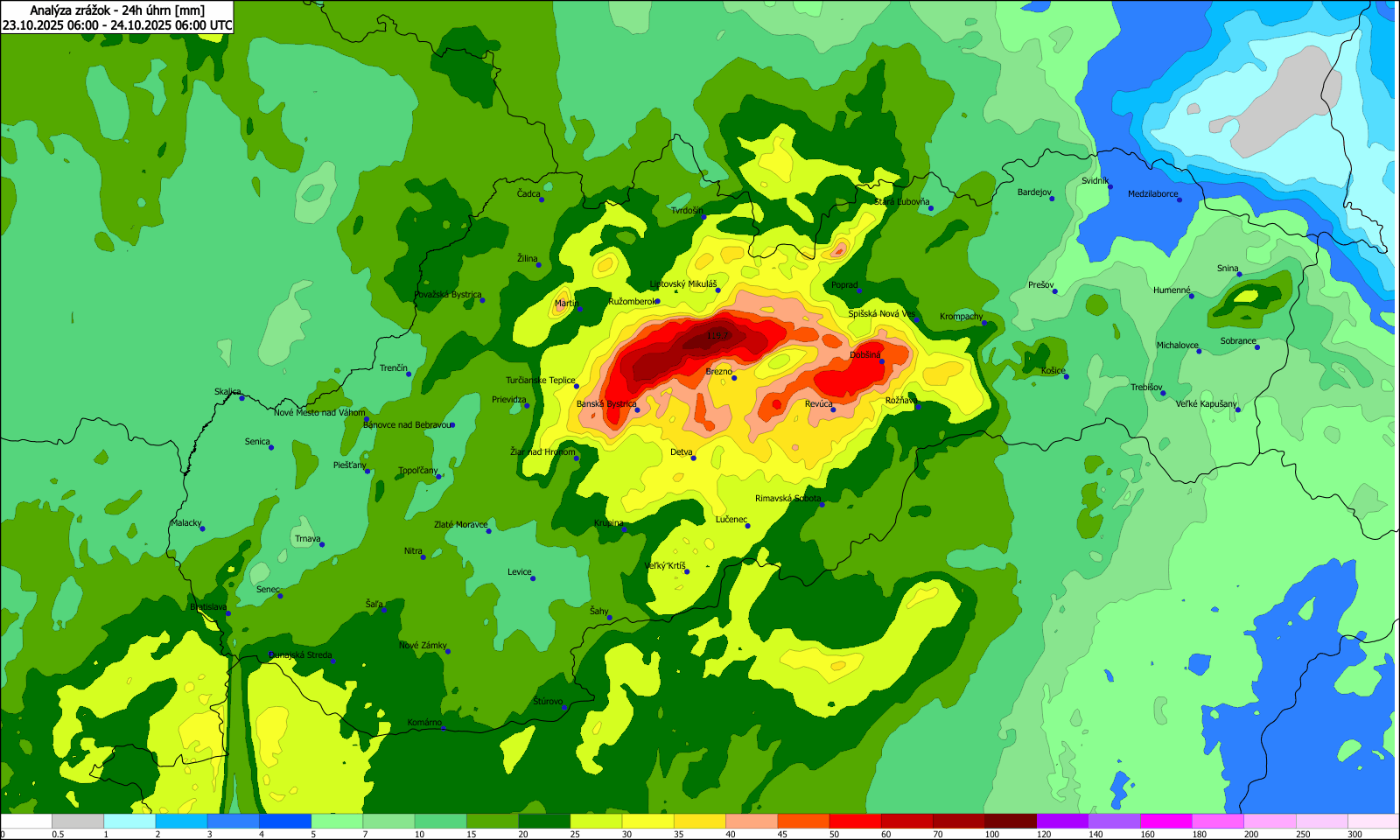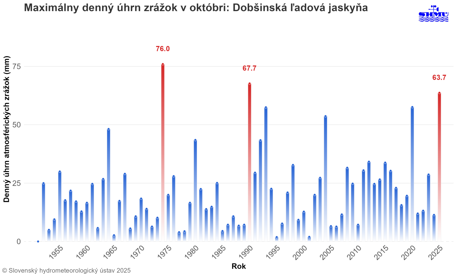 Podobne mimoriadne vysoký denný úhrn zrážok, 63,7 mm, zaznamenali 23.10.2025 aj na zrážkomernej stanici v Dobšinskej Ľadovej Jaskyni, ktorá je v priestore medzi Nízkymi Tatrami a Slovenským rodohorím. Tam to bol tretí najvyšší denný úhrn zrážok pre mesiac október od roku 1951 a vyšší denný úhrn zrážok tam v októbri zaznamenali iba 29.10.1990 (67,7 mm) a 20.10.1974 (76 mm). Pretože zrážky padali dlhší čas, na zrážkomernej stanici vo Vyšnej Boci zaregistrovali 23. a 24.10.2025 tretí najvyšší dvojdenný úhrn zrážok (93,4 mm) pre mesiac október od roku 1951. Vyššie dvojdenné úhrny zrážok tam v tomto centrálnom jesennom mesiaci za posledných 75 rokov zaznamenali iba 29. a 30.10.1990 (111,9 mm) a 20. a 21.10.1974 (135,1 mm.)