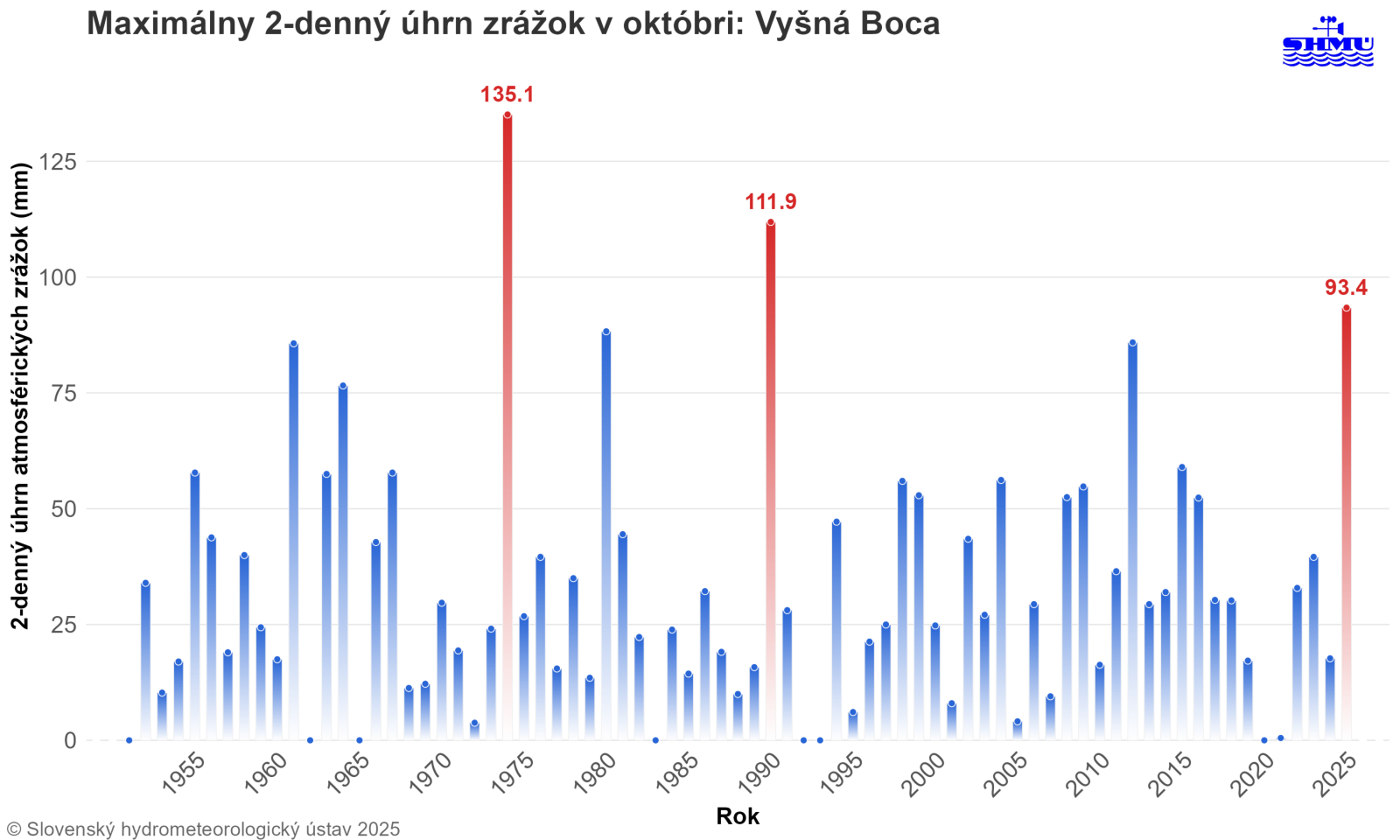 V tretej dekáde tohtoročného októbra sme v niektorých oblastiach Slovenska zaznamenali mimoriadne vysoké denné a dvojdenné úhrny zrážok. Na niektorých miestach sa zaradili medzi tri najvyššie hodnoty uvádzaných charakteristík zrážok. Zaujímavé bolo, že sa to napríklad na zrážkomernej stanici Magurka nevzťahovalo iba na mesiac október, ale bol to tretí najvyšší denný úhrn zrážok (23.10.2025), a to 107,1 mm, bez ohľadu na mesiac, aspoň od roku 1951. Vyšší denný úhrn zrážok tam v posledných 75 rokoch zaregistrovali 29.10.1990 (123,5 mm) a 18.10.1961 (124,0 mm).