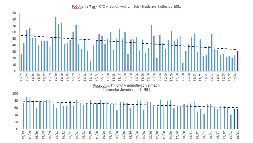 Podobný trend zaznamenávame aj vo vyšších polohách ako napríklad Tatranská Javorina, kde sme v zime zaznamenali 56 dní (DN 1991-2020: 68 dní). V porovnaní s dlhodobým normálom 1961-1990 sú počty mrazových dní zaznamenané v zime 2025/2026 výrazne nižšie (DN 1961-1990 Bratislava, Koliba: 50 dní, DN 1961-1990 Tatranská Javorina: 73 dní).