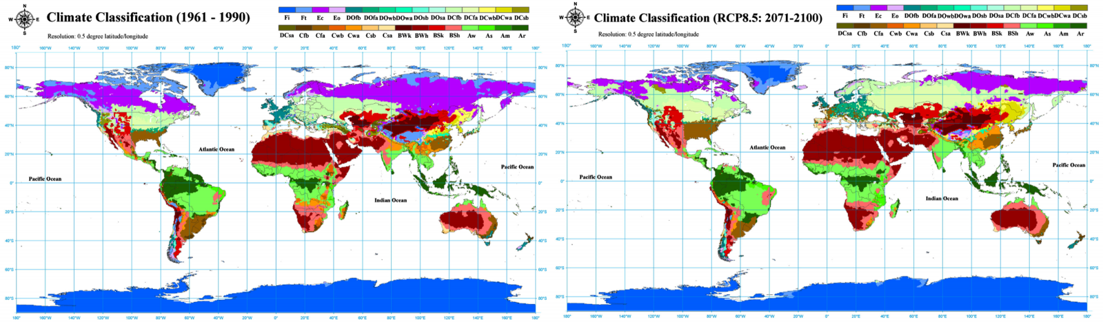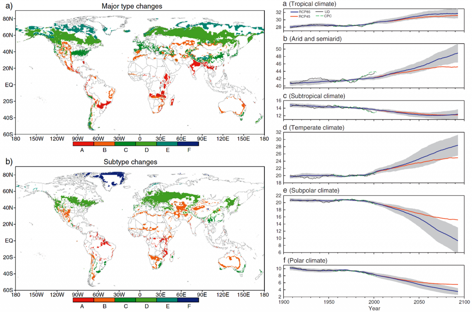A práve na analýzu zmien priestorového rozšírenia hlavných klimatických zón sa v poslednej dobe zameriava pomerne intenzívny výskum, jeden z tých významnejších bol publikovaný ešte v roku 2013 v časopise Global and Planetary Change (Feng et al. 2013). Na základe historických údajov teploty vzduchu a atmosférických zrážok z obdobia rokov 1900 - 2010 a výstupov 20 globálnych cirkulačných modelov v rámci CMIP5 (použitím emisných scenárov RCP4.5 a RCP8.5) analyzovali posuny, resp. zmeny rozsahu hlavných typov a podtypov klímy, určených Köppen-Threwarthovou klasifikáciou, v dôsledku súčasnej a očakávanej zmeny klímy (K-T klasifikácia obsahuje členenie globálnej klímy na šesť hlavných typov: A-F; A - tropická klíma, B – suchá „púštna“ klíma, C – subtropická alebo tiež mierne teplá klíma, D – mierne chladná klíma, E – subpolárna klíma, F – polárna klíma). Výsledky, ku ktorým sa výskumný tím dopracoval sú pritom veľmi zaujímavé. Autori v závere štúdie uvádzajú, že pokiaľ by došlo k naplneniu pesimistickejšieho RCP8.5 scenára, už do konca tohto storočia by došlo k zásadnému rozšíreniu teplejších, a najmä suchších typov klímy na takmer všetkých kontinentoch (RCP8.5 počíta s nárastom globálnej teploty do konca 21. storočia v rozsahu 3-10 °C). K najvýraznejším zmenám režimu podnebia by malo dôjsť na kontinentoch severnej pologule, a to prevažne v subtropickom a miernom klimatickom pásme, pričom úhrnne by zmeny mohli zasiahnuť takmer polovicu plochy všetkých kontinentov (46,3 %).
