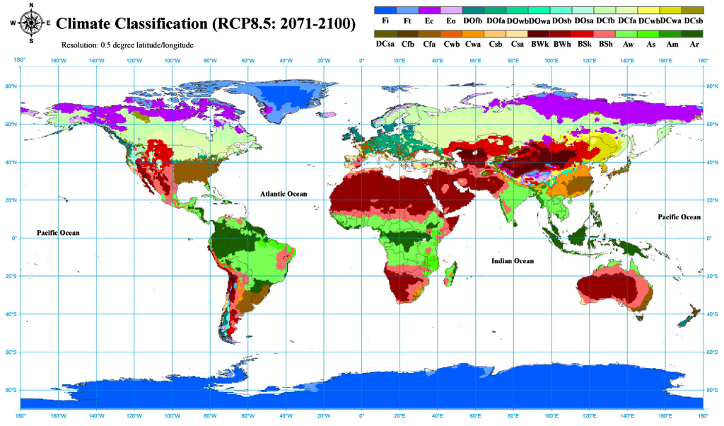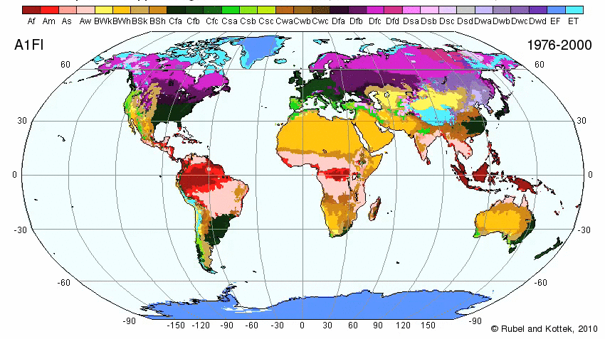 Obr. 2: Dlhodobé zmeny rozšírenia základných typov a podtypov Köppenovej klasifikácie v období rokov 1981 - 2100 podľa staršieho SRES scenára A1FI [Zdroj]