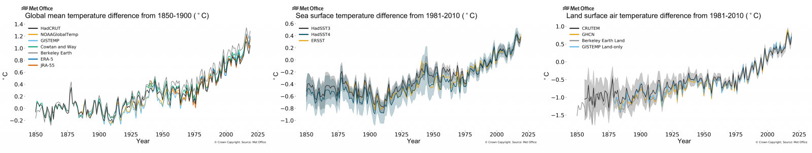 Obr. 1: Dlhodobý vývoj troch hlavných teplotných indikátorov: (1, vľavo) priemernej globálnej teploty povrchu pevnín a oceánov kombinovane; (2, v strede) priemernej globálnej teploty povrchu oceánov; a (3, vpravo) priemernej globálnej teploty povrchu pevnín (všetky vyjadrené v odchýlkach od dlhodobého priemeru) v období rokov 1850 - 2019 [Zdroj]