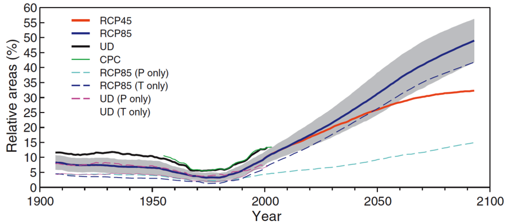 Obr. 5: Časový vývoj podielu plochy pevnín zasiahnutej zmenami (posunom) klimatických typov (podtypov) [%] - čierna a zelená línia reprezentujú merané údaje (UD a CPC databázy), modrá (červená) línia predstavuje očakávané (modelované) zmeny podľa RCP8.5 (RCP4.5) scenára [Zdroj: Feng et al. 2013]