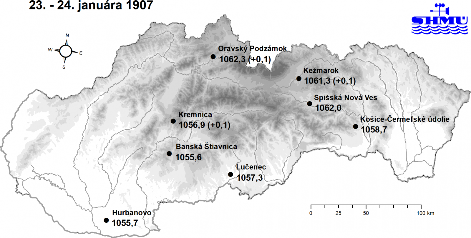 ▲ Obr. 10: Najvyššie zistené okamžité hodnoty tlaku vzduchu redukovaného na hladinu mora (možná odchýlka) [hPa] na meteorologických staniciach na Slovensku 23. ‒ 24. januára 1907.