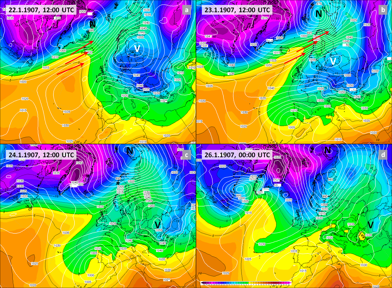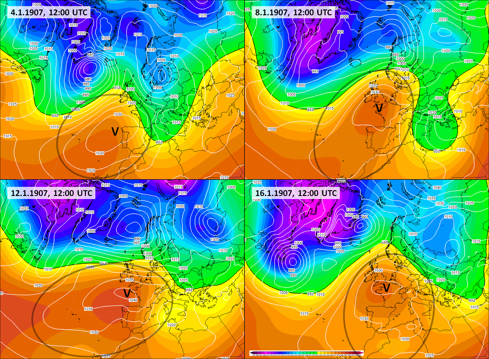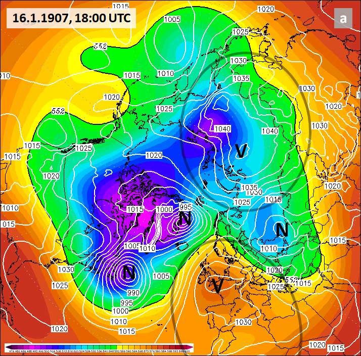 Tlaková výš (anticyklóna), ktorá do našej oblasti počas prvých dvoch dekád januára 1907 sporadicky zasahovala od západu, bola tzv. dynamická, teda na jej zmohutnení sa výrazne podieľa hrebeň vysokého tlaku vo vyšších hladinách troposféry (obr. 1a – farebná škála). Odbornejšie – významnú úlohu tu zohráva tzv. advekcia (presun s prúdením) anticyklonálnej vorticity (mikroskopickej rotácie v smere hodinových ručičiek), ktorá s rastúcou výškou narastá a najvýraznejšia je práve na prednej strane výškových hrebeňov (tie sú spojené s prúdením teplého vzduchu). To podporuje zostupné pohyby vzduchu v hrubej vrstve troposféry, a tie tak generujú vzostup tlaku vzduchu pri povrchu, teda prízemnú tlakovú výš. Výš, pri ktorej dominuje dynamický vplyv, je teda spojená s výrazným výškovým hrebeňom, v neskoršej fáze často aj so samostatným výškovým jadrom, teda zaberá celú hrúbku troposféry (vývoj takejto výše sme popísali TU alebo TU). V priebehu životného cyklu výše sa prízemný stred postupne stotožňuje s výškovým, čím sa výš stáva málo pohyblivá a postupne slabne. Je to však pomalý proces, a tak môže zotrvať nad rovnakým miestom dlhšiu dobu (čo môže viesť k extrémom v počasí, napr. horúčavy v západnej Európe v roku 2019). V prípade výše, ktorá má výraznú výškovú podporu, sa postupne väčšina jej plochy nachádza v teplom vzduchu. Na jej prednej strane (zväčša východnom okraji) síce prúdi chladný vzduch do nižších zemepisných šírok, čo tiež podporuje vzostup tlaku vzduchu pri povrchu, no oproti spomínanej dynamickej podpore je tento vplyv slabý. Typicky ide o subtropickú tlakovú výš, ktorá niekedy zasahuje aj do vyšších zemepisných šírok. Okrem toho sa bežne stáva, že tlaková výš, ktorá už začína slabnúť, sa spojí s novou mladou tlakovou výšou, čím sa obnoví a opäť zmohutnie. Takto sa môže cyklicky obnovovať aj niekoľkokrát, čo v extrémnych prípadoch trvá aj niekoľko týždňov (prípadne sa útvar v určitej oblasti obnovuje pravidelne, a tak je po tejto oblasti pomenovaný, ako napr. azorská tlaková výš, islandská tlaková níž, iránska níž, janovská níž... – platí všeobecne, nie len pre dynamické vplyvy). Aj v januári 1907 sa stalo, že sa výš nad západnou Európou popísaným spôsobom niekoľkokrát obnovila, v dôsledku čoho sa tu udržala dlhú dobu, od 4. do 22. januára. Maximum tlaku vzduchu v strede týchto „dynamických“ výší býva zväčša medzi 1030-1040 hPa (v zime viac ako v lete), len zriedkavo aj viac, ako napr. v roku 2020, kedy sme v takto generovanej výši zaznamenali mimoriadne hodnoty tlaku vzduchu aj na území Slovenska.