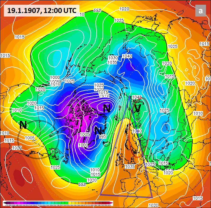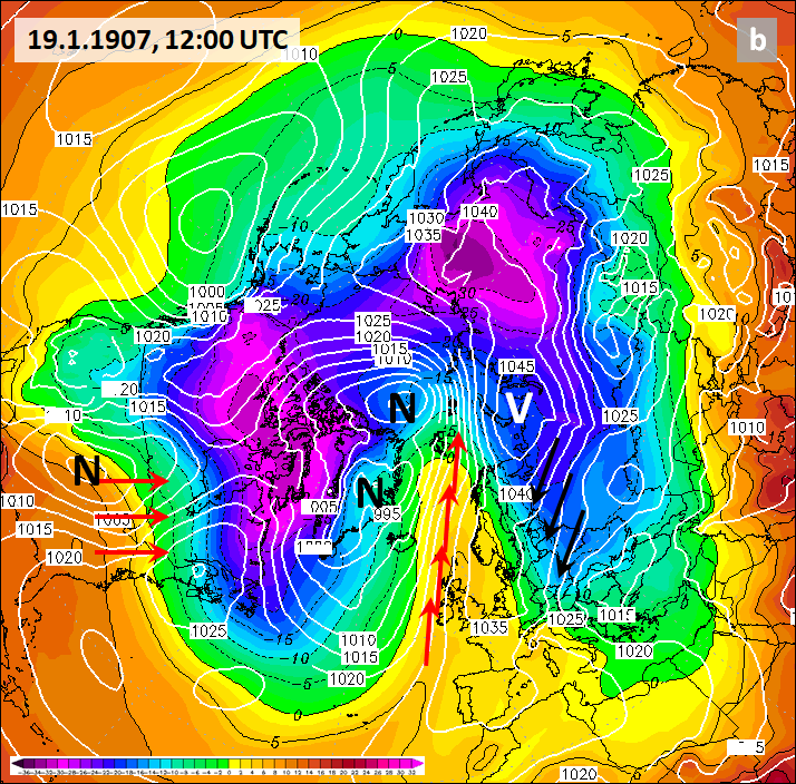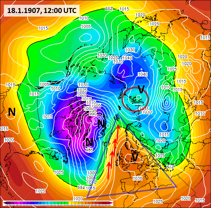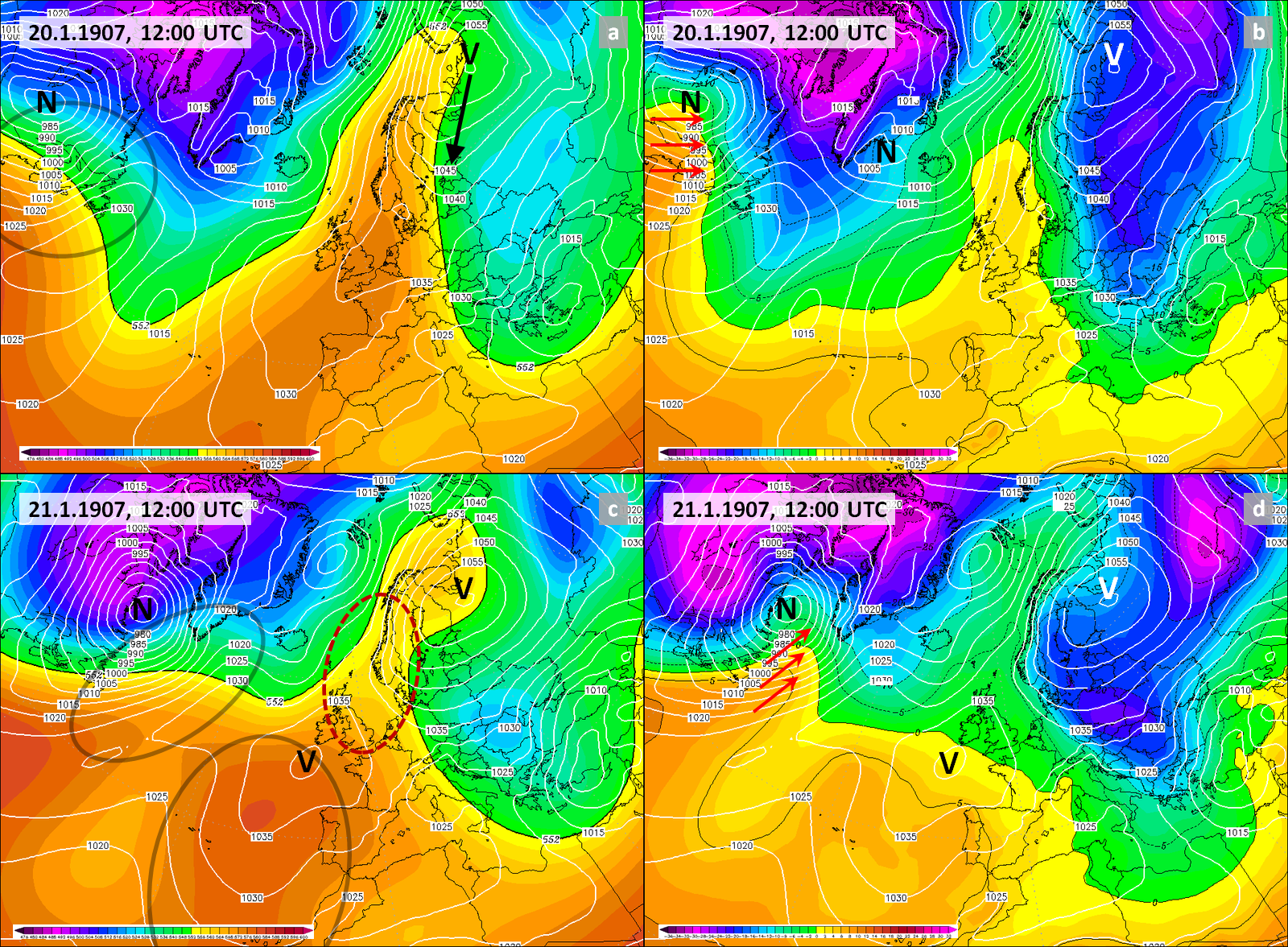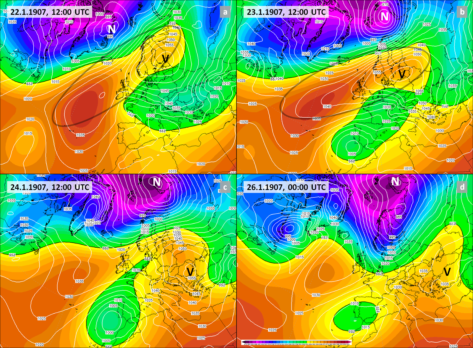 Tlaková výš (anticyklóna), ktorá do našej oblasti počas prvých dvoch dekád januára 1907 sporadicky zasahovala od západu, bola tzv. dynamická, teda na jej zmohutnení sa výrazne podieľa hrebeň vysokého tlaku vo vyšších hladinách troposféry (obr. 1a – farebná škála). Odbornejšie – významnú úlohu tu zohráva tzv. advekcia (presun s prúdením) anticyklonálnej vorticity (mikroskopickej rotácie v smere hodinových ručičiek), ktorá s rastúcou výškou narastá a najvýraznejšia je práve na prednej strane výškových hrebeňov (tie sú spojené s prúdením teplého vzduchu). To podporuje zostupné pohyby vzduchu v hrubej vrstve troposféry, a tie tak generujú vzostup tlaku vzduchu pri povrchu, teda prízemnú tlakovú výš. Výš, pri ktorej dominuje dynamický vplyv, je teda spojená s výrazným výškovým hrebeňom, v neskoršej fáze často aj so samostatným výškovým jadrom, teda zaberá celú hrúbku troposféry (vývoj takejto výše sme popísali TU alebo TU). V priebehu životného cyklu výše sa prízemný stred postupne stotožňuje s výškovým, čím sa výš stáva málo pohyblivá a postupne slabne. Je to však pomalý proces, a tak môže zotrvať nad rovnakým miestom dlhšiu dobu (čo môže viesť k extrémom v počasí, napr. horúčavy v západnej Európe v roku 2019). V prípade výše, ktorá má výraznú výškovú podporu, sa postupne väčšina jej plochy nachádza v teplom vzduchu. Na jej prednej strane (zväčša východnom okraji) síce prúdi chladný vzduch do nižších zemepisných šírok, čo tiež podporuje vzostup tlaku vzduchu pri povrchu, no oproti spomínanej dynamickej podpore je tento vplyv slabý. Typicky ide o subtropickú tlakovú výš, ktorá niekedy zasahuje aj do vyšších zemepisných šírok. Okrem toho sa bežne stáva, že tlaková výš, ktorá už začína slabnúť, sa spojí s novou mladou tlakovou výšou, čím sa obnoví a opäť zmohutnie. Takto sa môže cyklicky obnovovať aj niekoľkokrát, čo v extrémnych prípadoch trvá aj niekoľko týždňov (prípadne sa útvar v určitej oblasti obnovuje pravidelne, a tak je po tejto oblasti pomenovaný, ako napr. azorská tlaková výš, islandská tlaková níž, iránska níž, janovská níž... – platí všeobecne, nie len pre dynamické vplyvy). Aj v januári 1907 sa stalo, že sa výš nad západnou Európou popísaným spôsobom niekoľkokrát obnovila, v dôsledku čoho sa tu udržala dlhú dobu, od 4. do 22. januára. Maximum tlaku vzduchu v strede týchto „dynamických“ výší býva zväčša medzi 1030-1040 hPa (v zime viac ako v lete), len zriedkavo aj viac, ako napr. v roku 2020, kedy sme v takto generovanej výši zaznamenali mimoriadne hodnoty tlaku vzduchu aj na území Slovenska.