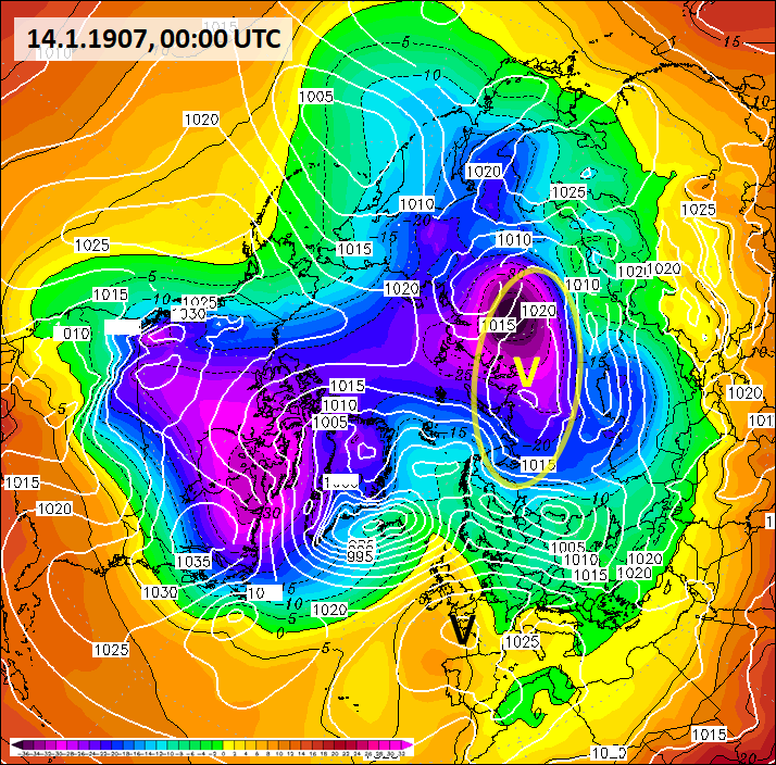 ▲ Animácia 1: Vývoj poľa tlaku vzduchu prepočítaného na hladinu mora 1. až 26. januára 1907 [hPa] (animácia od začiatku vývoja sibírskej tlakovej výše vo vyššom rozlíšení). NOAA 20th Century Reanalysis, spracovanie M. Šinger.