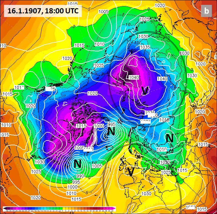 Ako sme už spomenuli vyššie, azorská tlaková výš bola "nachystaná" nad západnou Európou a priľahlým Atlantikom už od 4. januára 1907. Jej fyzikálne inak formovaný náprotivok – radiačná tlaková výš na Sibíri – sa podľa dostupných reanalýz začal formovať niekedy medzi 12. a 14. januárom v okolí Uralu a západnej Sibíri (obr. 2). Už 16. januára tlak vzduchu v jej strede presahoval 1045 hPa, pričom sa celá nachádzala vo veľmi studenom vzduchu (obr. 3b), čo bolo viac ako v tlakovej výši nad západnou Európou (slabo cez 1035 hPa). Vo vyšších hladinách sme ju neidentifikovali, na rozdiel od vertikálne mohutnej dynamickej výše nad západnou Európou (obr. 3a).