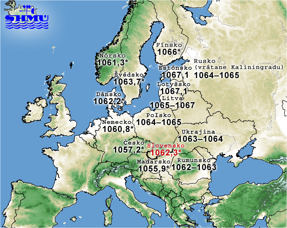 ▲ Obr. 9: Najvyššie známe dokumentované hodnoty redukovaného tlaku vzduchu [hPa] vo vybraných európskych krajinách 22. ‒ 24. januára 1907. Hviezdičkou sú označené hodnoty, oficiálne evidované príslušnými národnými meteorologickými službami a spoločnosťami. V ostatných prípadoch ide o hodnoty/interval podľa rôznych dostupných odborných publikácií. Údaje môžu byť neúplné.