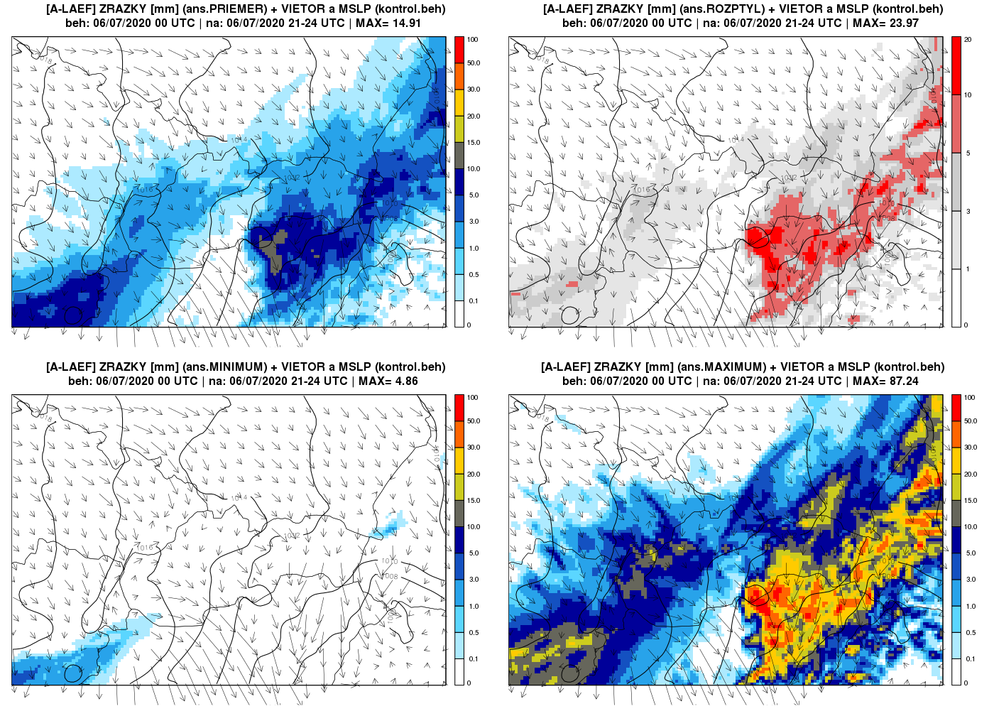 Obr. 1 Predpoveď celkových zrážok platná na 6. júla medzi 21 až 24 UTC (úhrn v mm/3h). Vľavo hore priemer ansámbla, vpravo hore rozptyl ansámbla, vľavo dole minimum ansámbla a vpravo dole maximum ansámbla. Zároveň je na mapách zobrazené aj pole atmosférického tlaku redukovaného na hladinu mora (izobary po 2 hPa) a smer vetra (šípky) z kontrolného neperturbovaného behu A-LAEF.