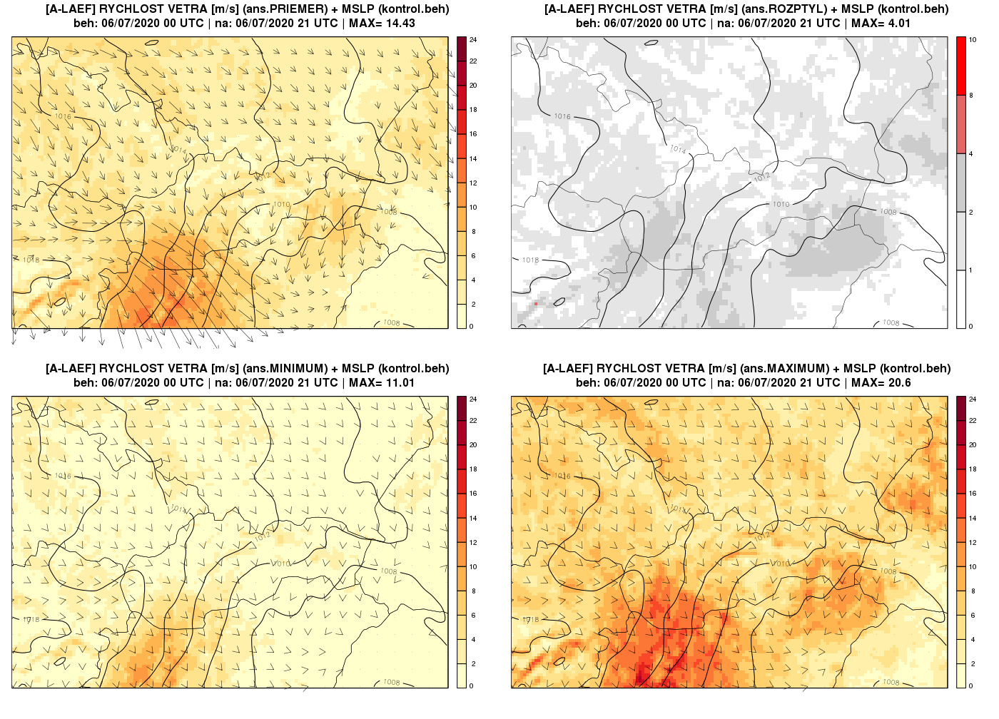 Obr. 2 Predpoveď smeru a rýchlosti vetra platná na 6. júla o 21 UTC (m/s). Vľavo hore priemer ansámbla, vpravo hore rozptyl ansámbla, vľavo dole minimum ansámbla a vpravo dole maximum ansámbla. Zároveň je na mapách zobrazené aj pole atmosférického tlaku redukovaného na hladinu mora (izobary po 2 hPa) z kontrolného neperturbovaného behu A-LAEF.