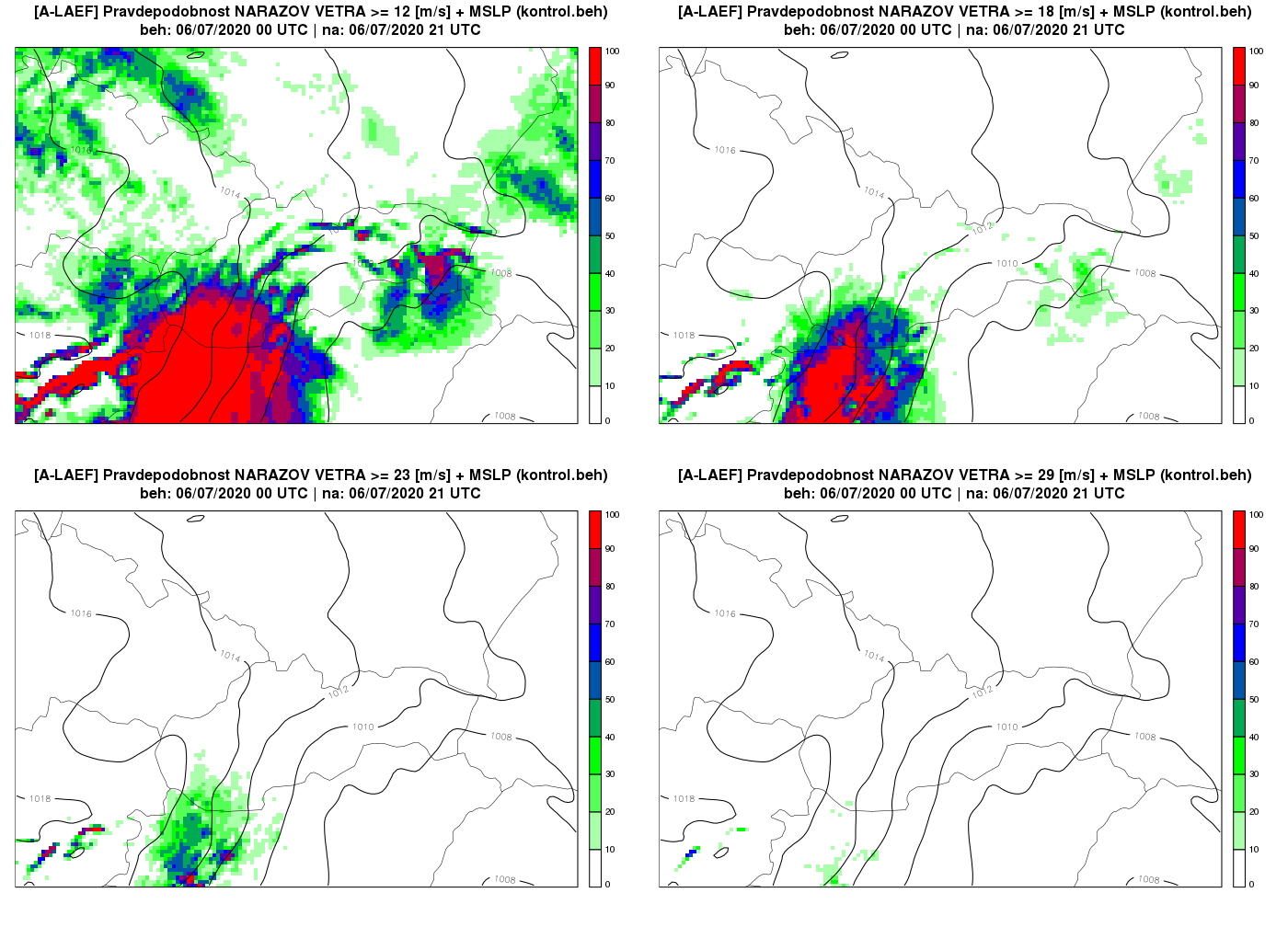 Obr. 3 Pravdepodobnosť nárazov vetra platná na 6. júla o 21 UTC (%) pre rôzne hraničné hodnoty. Vľavo hore pravdepodobnosť nárazov vetra aspoň 12 m/s, vpravo hore aspoň 18 m/s, vľavo dole viac ako 23 m/s vrátane a vpravo dole pravdepodobnosť nárazov presahujúca rýchlosť až 29 m/s vrátane. Zároveň je na mapách zobrazené aj pole atmosférického tlaku redukovaného na hladinu mora (izobary po 2 hPa) z kontrolného neperturbovaného behu A-LAEF.