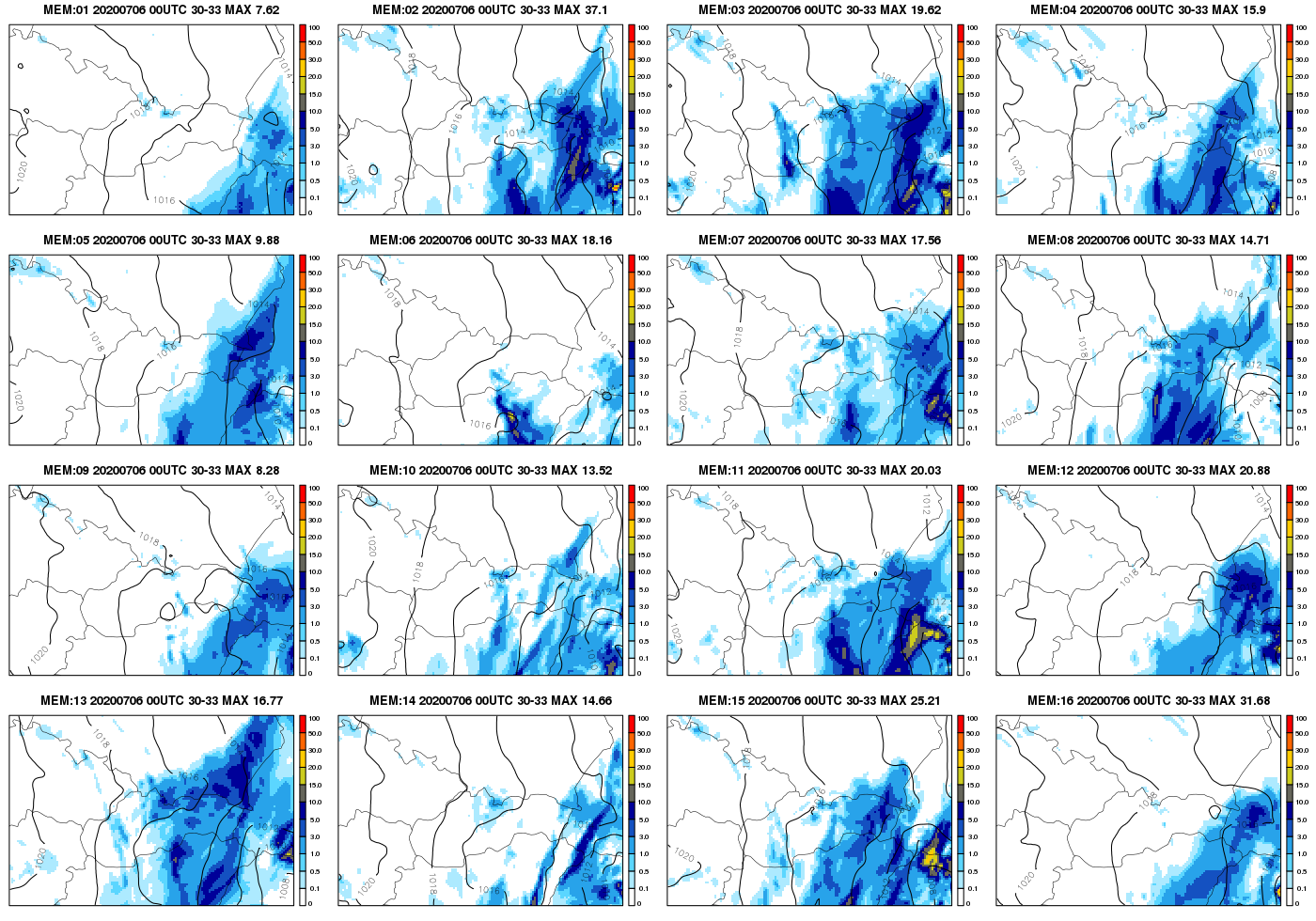 Obr. 4 Predpoveď celkových zrážok z 6.7.2020 00 UTC na 30 až 33 hodín dopredu pre jednotlivé členy A-LAEF ansámbla (úhrn v mm/3h). Z ľavého horného rohu od 1. člena ansámbla až po 16. člen ansámbla v pravom dolnom rohu. Zároveň je na mapách zobrazené aj pole atmosférického tlaku redukovaného na hladinu mora (izobary po 2 hPa) pre konkrétny člen A-LAEF ansámbla.