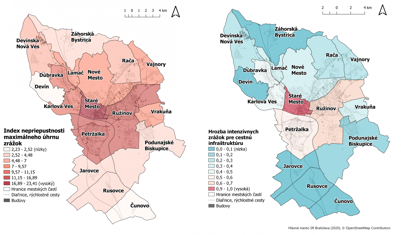 ▲ Obr. 3: Príklad priestorového spracovania indikátora indexu nepriepustnosti maximálneho úhrnu zrážok (vľavo) a hrozby intenzívnych zrážok pre cestnú infraštruktúru na území Bratislavy (Atlas, str. 72).