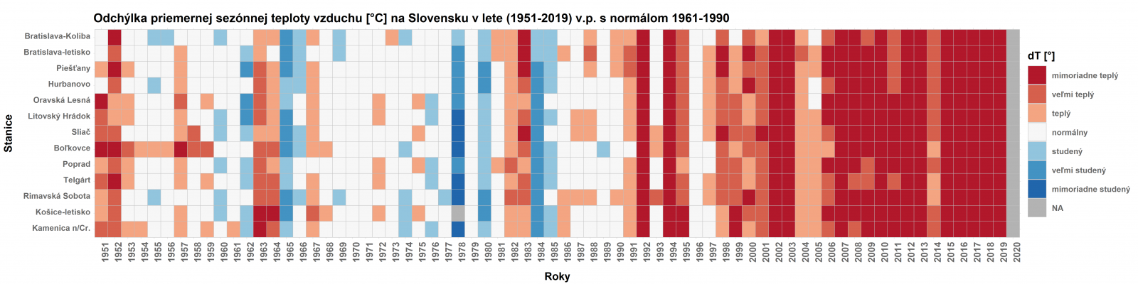 ▲ Obr. 1: Dlhodobé zmeny priemernej sezónnej teploty vzduchu v lete (vyjadrené v odchýlkach od normálu 1961-1990) na vybraných meteorologických staniciach na Slovensku (13 staníc) v období rokov 1951-2020 podľa údajov SHMÚ [obrázok nie je publikovaný v Atlase].