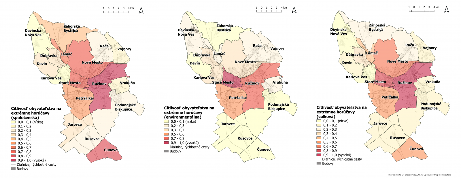 ▲ Obr. 2: Príklad priestorového spracovania indikátora spoločenskej (vľavo), environmentálnej (v strede) a celkovej (vpravo) citlivosti obyvateľstva na extrémne horúčavy na území Bratislavy (Atlas, str. 34-35).