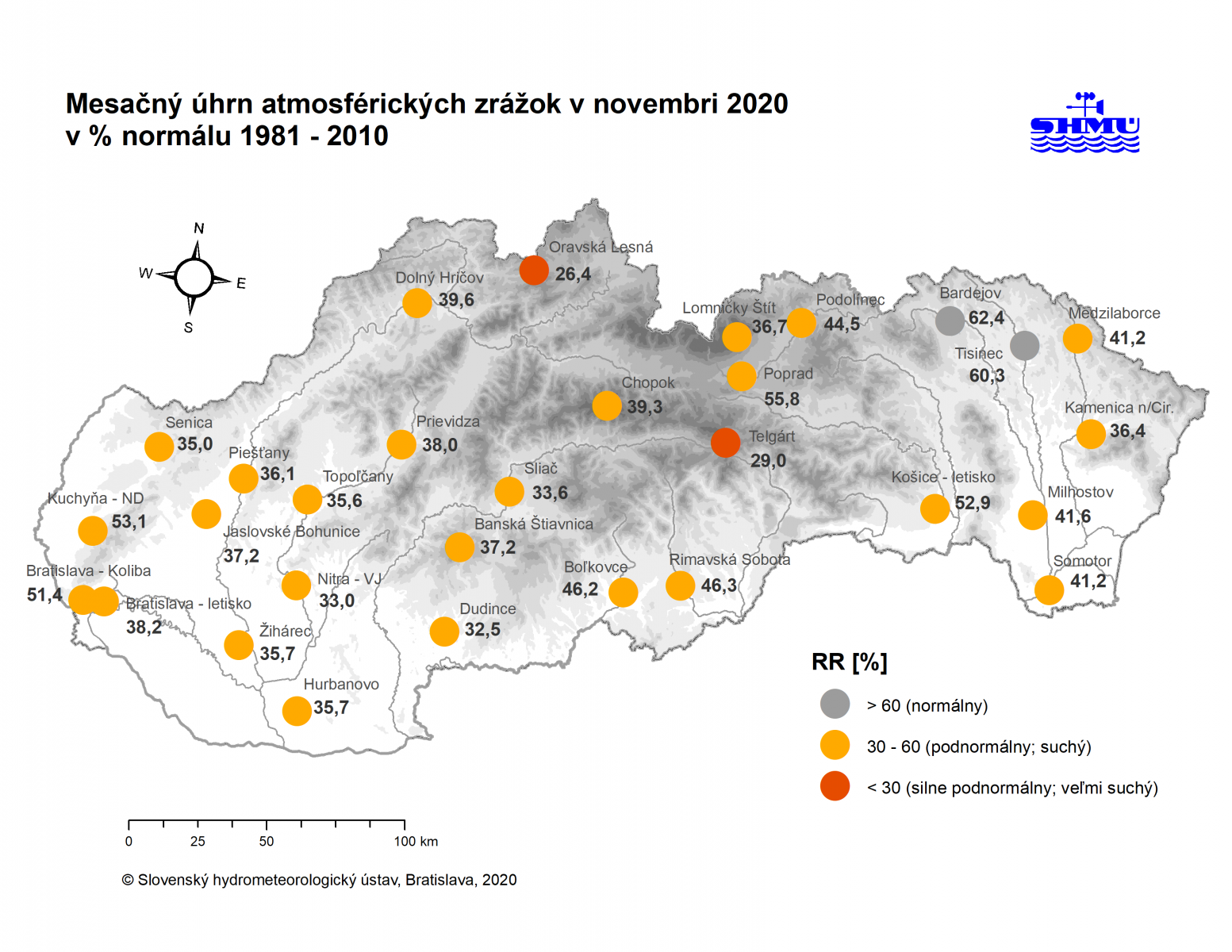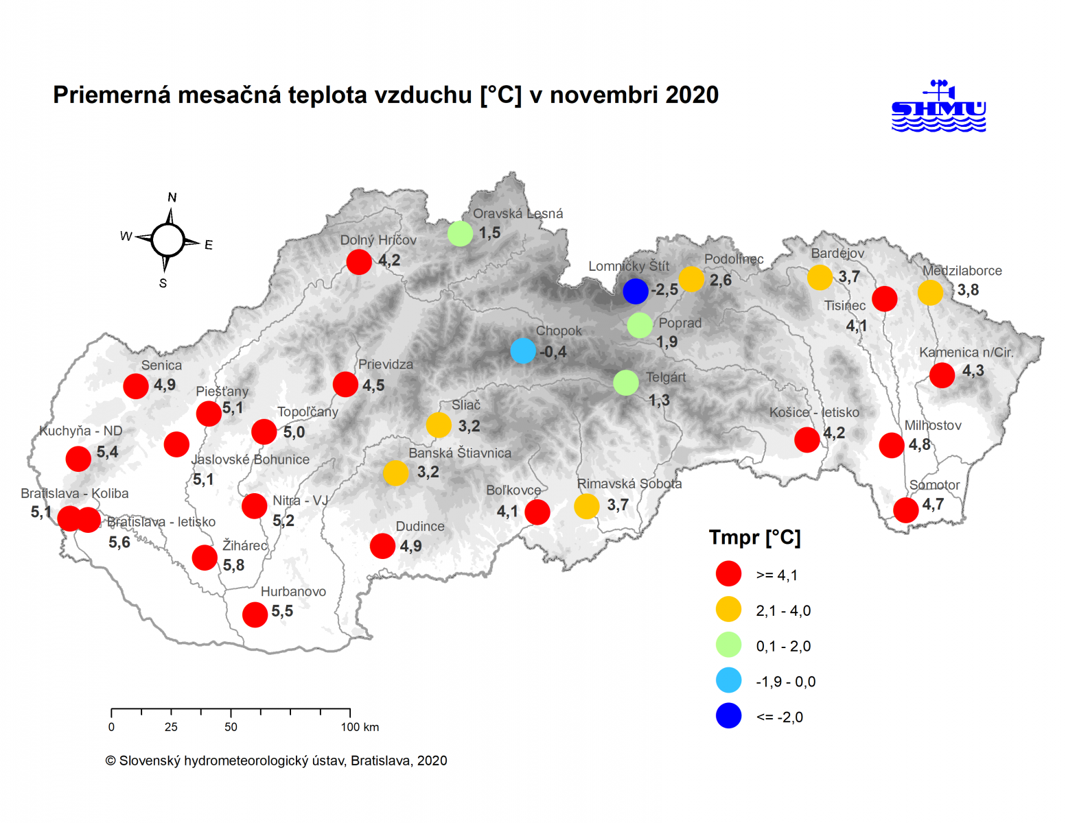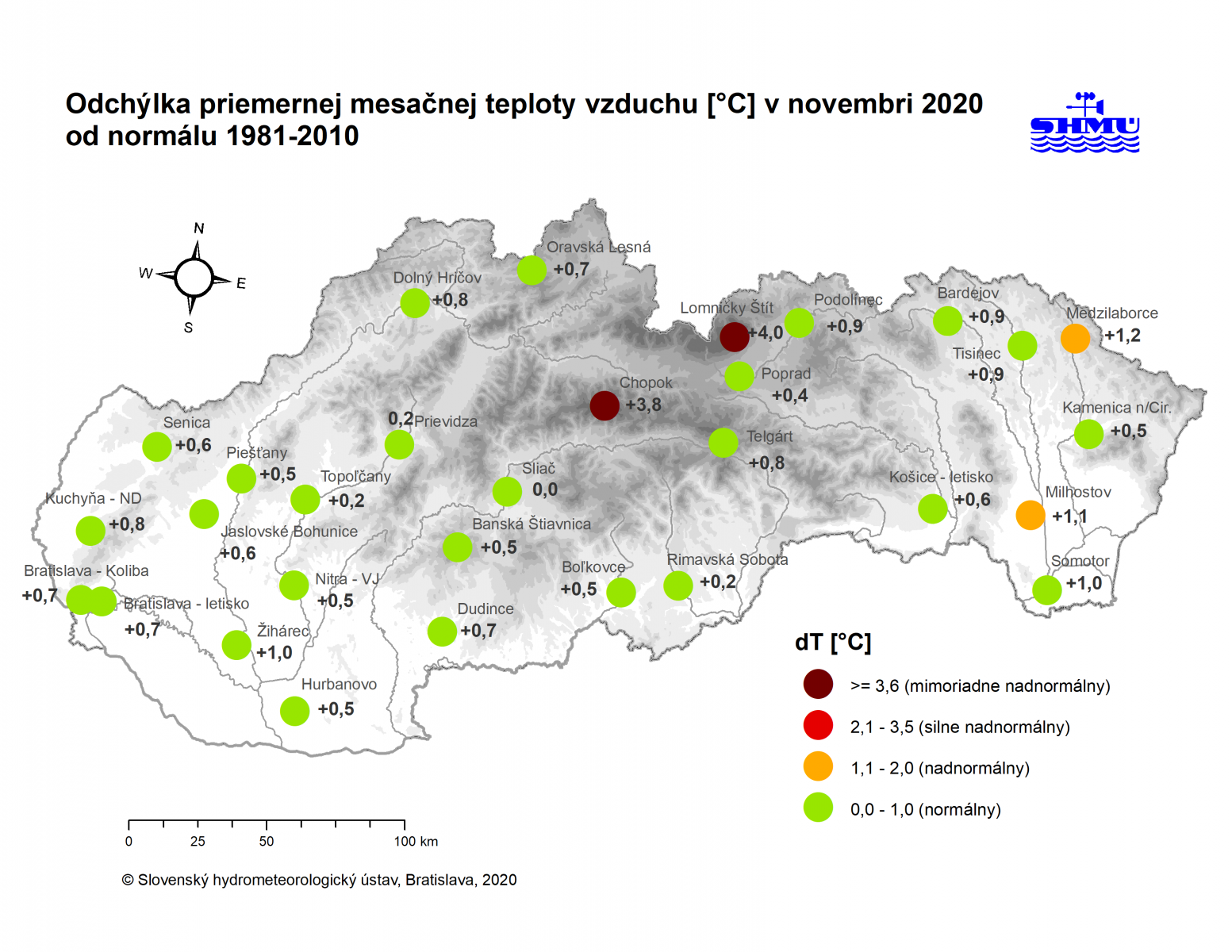 November 2020 – Na väčšine územia teplotne normálny, vo vysokých polohách mimoriadne nadnormálny a zrážkovo podnormálny.
