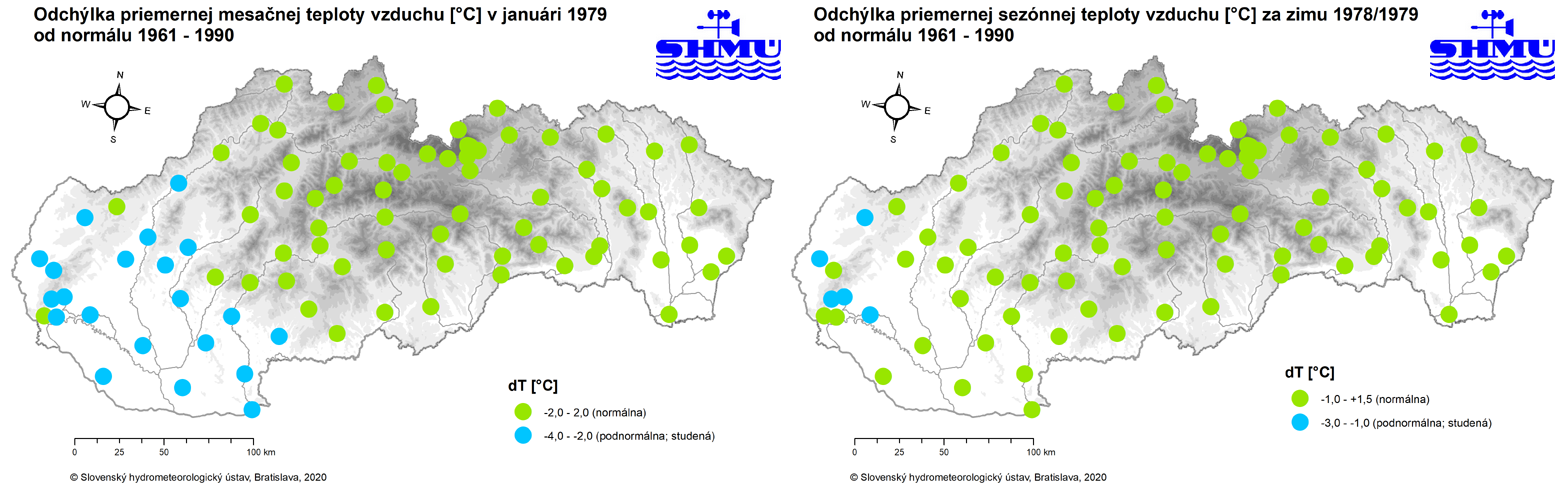 ▲ Obr. 1: Odchýlka priemernej mesačnej/sezónnej teploty vzduchu v januári 1979 (vľavo) a za zimu 1978/1979 (vpravo) od normálu 1961 – 1990 na meteorologických staniciach na Slovensku.