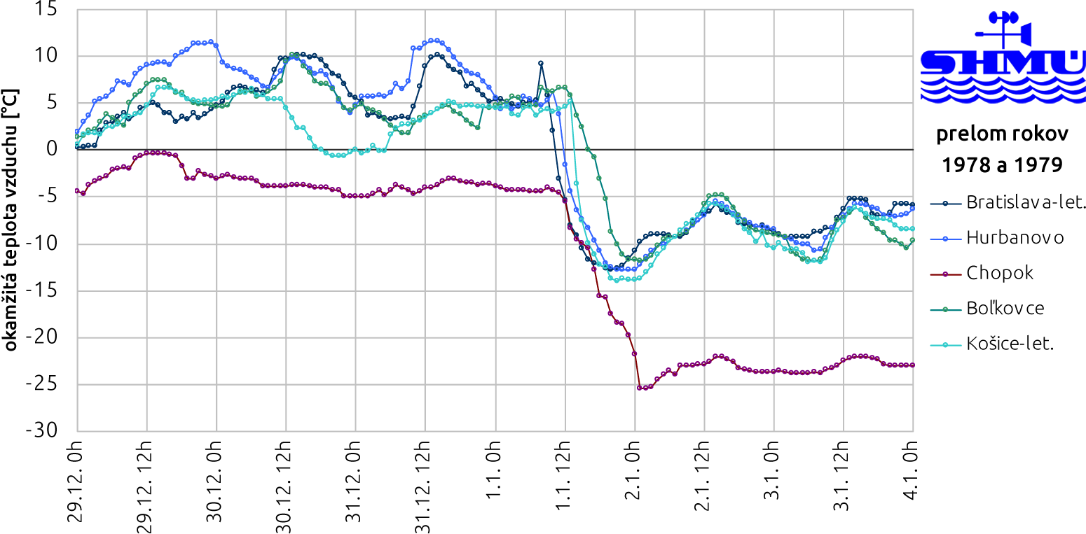 ▲ Obr. 3: Vývoj okamžitej teploty vzduchu v hodinovom intervale na vybraných meteorologických staniciach na Slovensku na prelome rokov 1978 a 1979.