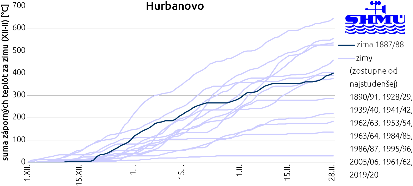 ▲ Obr. 2: Vývoj sumy záporných teplôt za zimu (december-február) [°C] v priebehu vybraných zím v Hurbanove. Zima so sumou záporných teplôt 300 stupňov a viac patrí v našich nížinách medzi tuhé zimy.