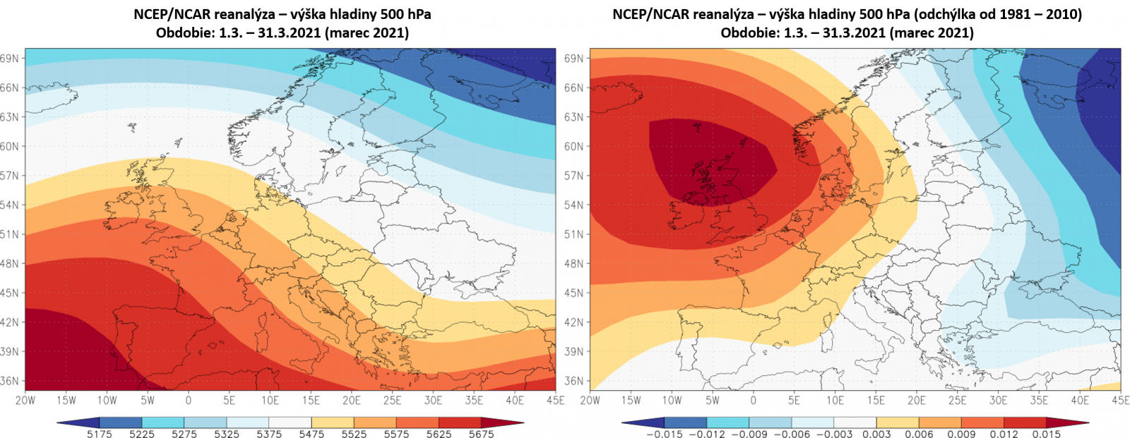▲ Obr. 1: Reanalýza priemernej výšky hladiny 500 hPa (vľavo - absolútne hodnoty; vpravo - odchýlka od normálu 1981 - 2010) v období 1.3. - 31.3.2021 (zdroj: NCEP/NCAR).
