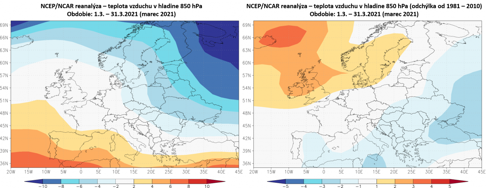 ▲ Obr. 2: Reanalýza priemernej teploty vzduchu v hladine 850 hPa (vľavo - absolútne hodnoty; vpravo - odchýlka od normálu 1981 - 2010) v období 1.3. - 31.3.2021 (zdroj: NCEP/NCAR).