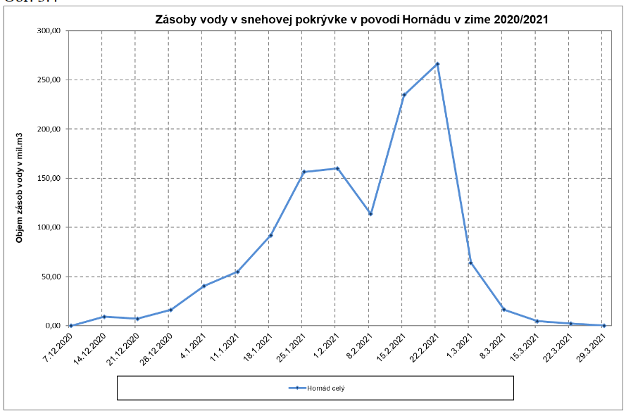Obr. 7 Vývoj zásob vody v snehovej pokrývke v povodí Hornádu v zime 2020/2021