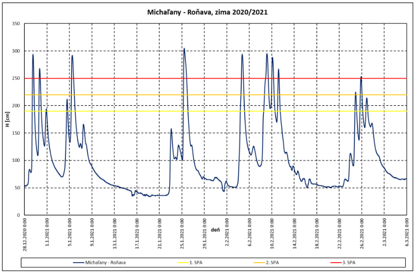 Obr. 8 Priebeh vodnej hladiny v Michaľanoch na Roňave od 28.12.2020 do 6.3.2021