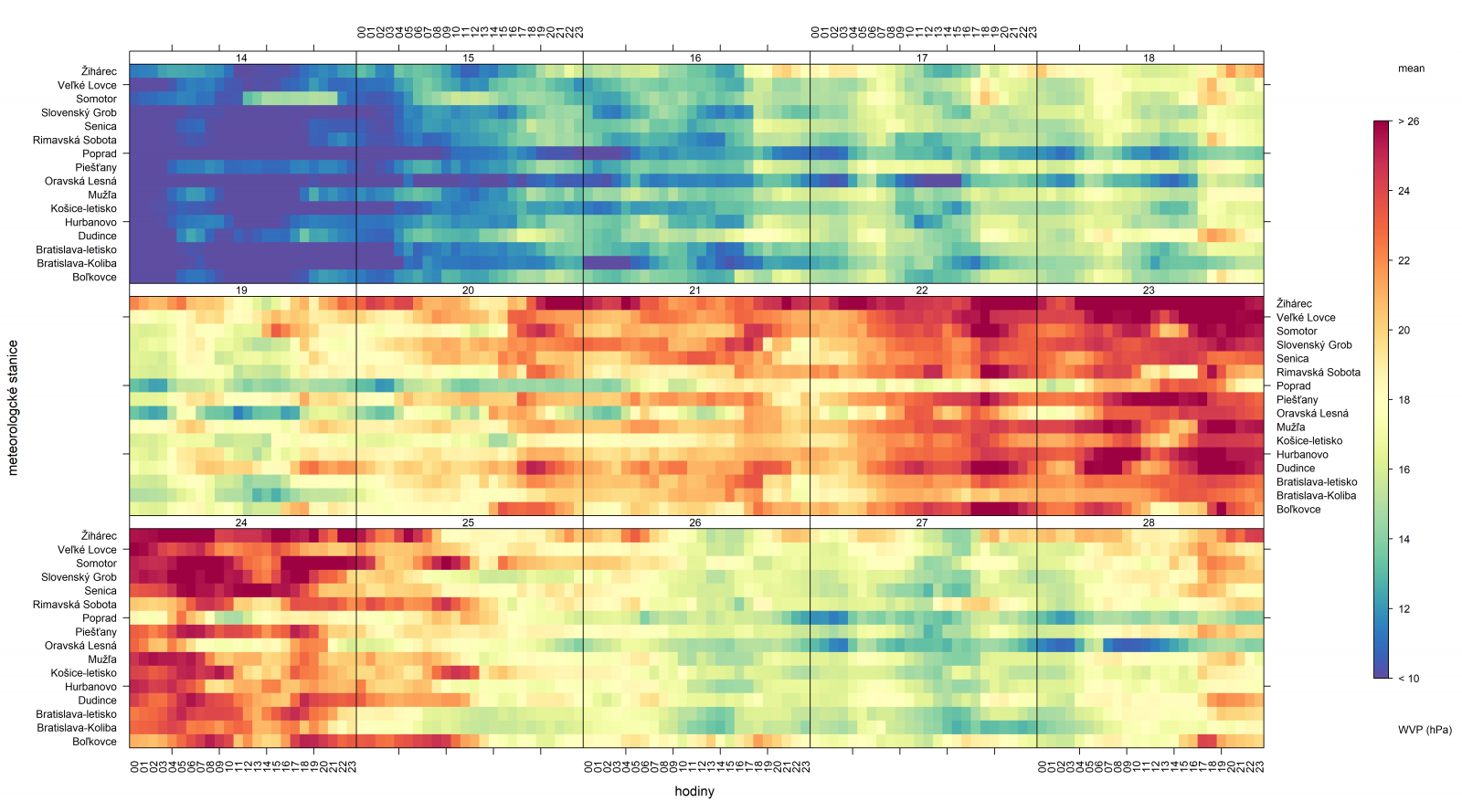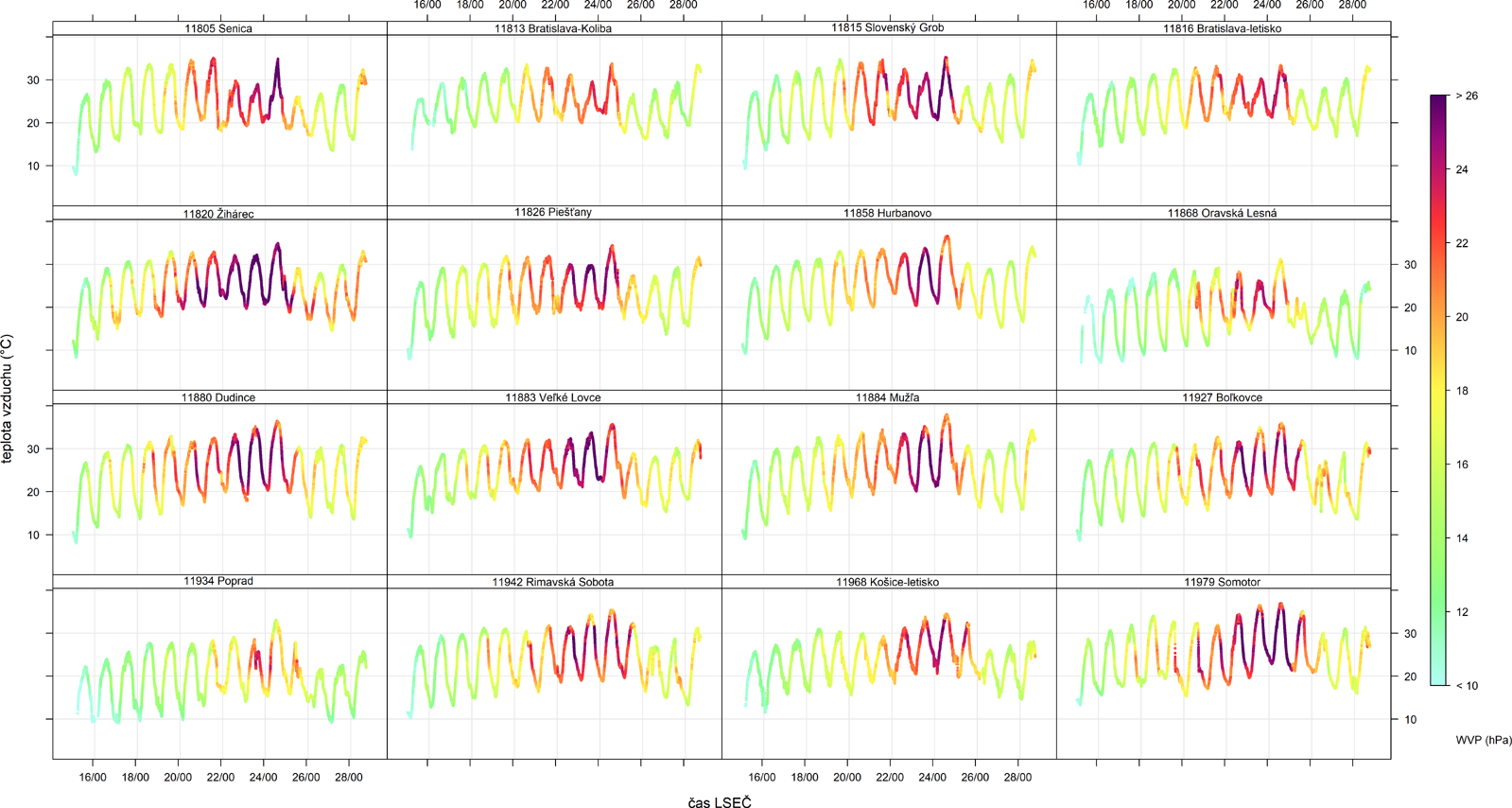 ▲ Obr. 6: Hodnoty parciálneho tlaku vodnej pary na vybraných meteorologických staniciach na Slovensku v období 14. – 28. juna 2021 v hodinovom intervale.