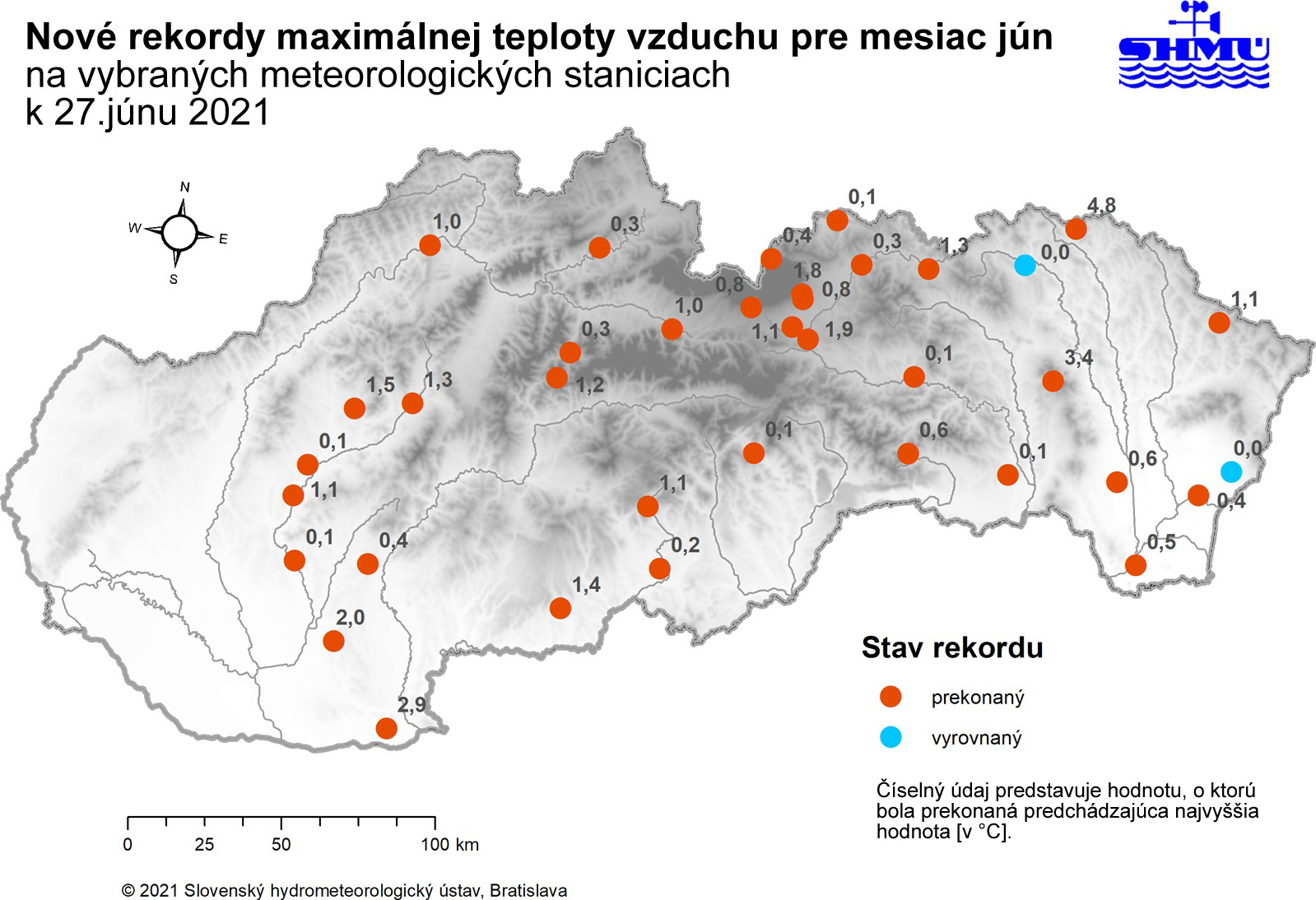 Ako už bolo informované, vo štvrtok 24. júna 2021 sme na Slovensku len druhýkrát v ére meteorologických meraní zaznamenali v júni teplotu vzduchu 38 °C, a to na meteorologickej stanici Mužla (38,0 °C). Na aspoň 37 °C teplota vystúpila taktiež v Dolných Plachtinciach a v Somotore (zhodne 37,0 °C). Nie je prekvapujúce, že sme zaznamenali množstvo vyrovnaných, resp. prekonaných staničných extrémov maximálnej teploty vzduchu pre mesiac jún (obr. 1); z tých najpozoruhodnejšich spomeňme nový rekordný údaj na stanici Košice-letisko (34,8 °C) za rovných 100 rokov jej prevádzky, v Trebišove-Milhostove (35,9 °C) za uplynulých minimálne 92 rokov, v Liptovskom Hrádku (34,5 °C) za minimálne 91 rokov, alebo v Poprade (33,5 °C) za 76 rokov. Na mnohých miestach boli pritom rekordy júnového maxima prekonané aj výraznejšie o vyše 1 °C (obr. 1; zo staníc s dlhšími časovými radmi najvýraznejšie napr. v Gánovciach o 1,9 °C, v Tatranskej Lomnici o 1,8 °C, či v Dolných Plachtinciach o 1,4 °C).