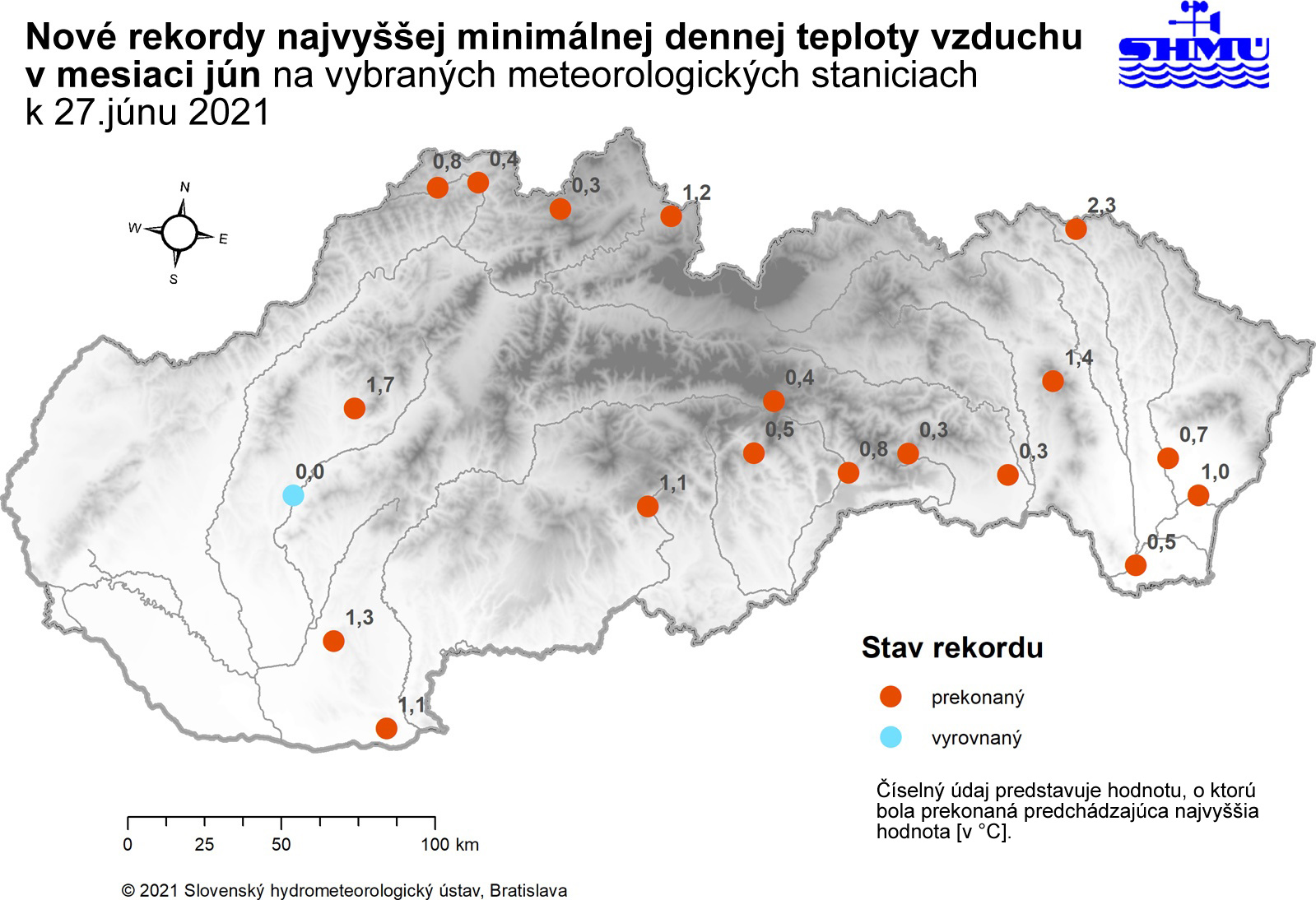 ▲ Obr. 2: Rekordy najvyššej minimálnej dennej teploty vzduchu v mesiaci jún, zaznamenané počas prvej vlny horúčav v roku 2021 na meteorologických staniciach na Slovensku do 27. júna 2021 vrátane.