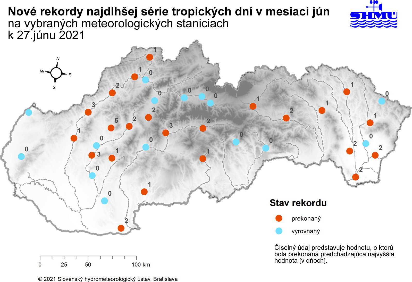 ▲ Obr. 3: Rekordy najdlhšej série (trvanie minimálne 2 dni) tropických dní v mesiaci jún, zaznamenané počas prvej vlny horúčav v roku 2021 na meteorologických staniciach na Slovensku do 27. júna 2021 vrátane.