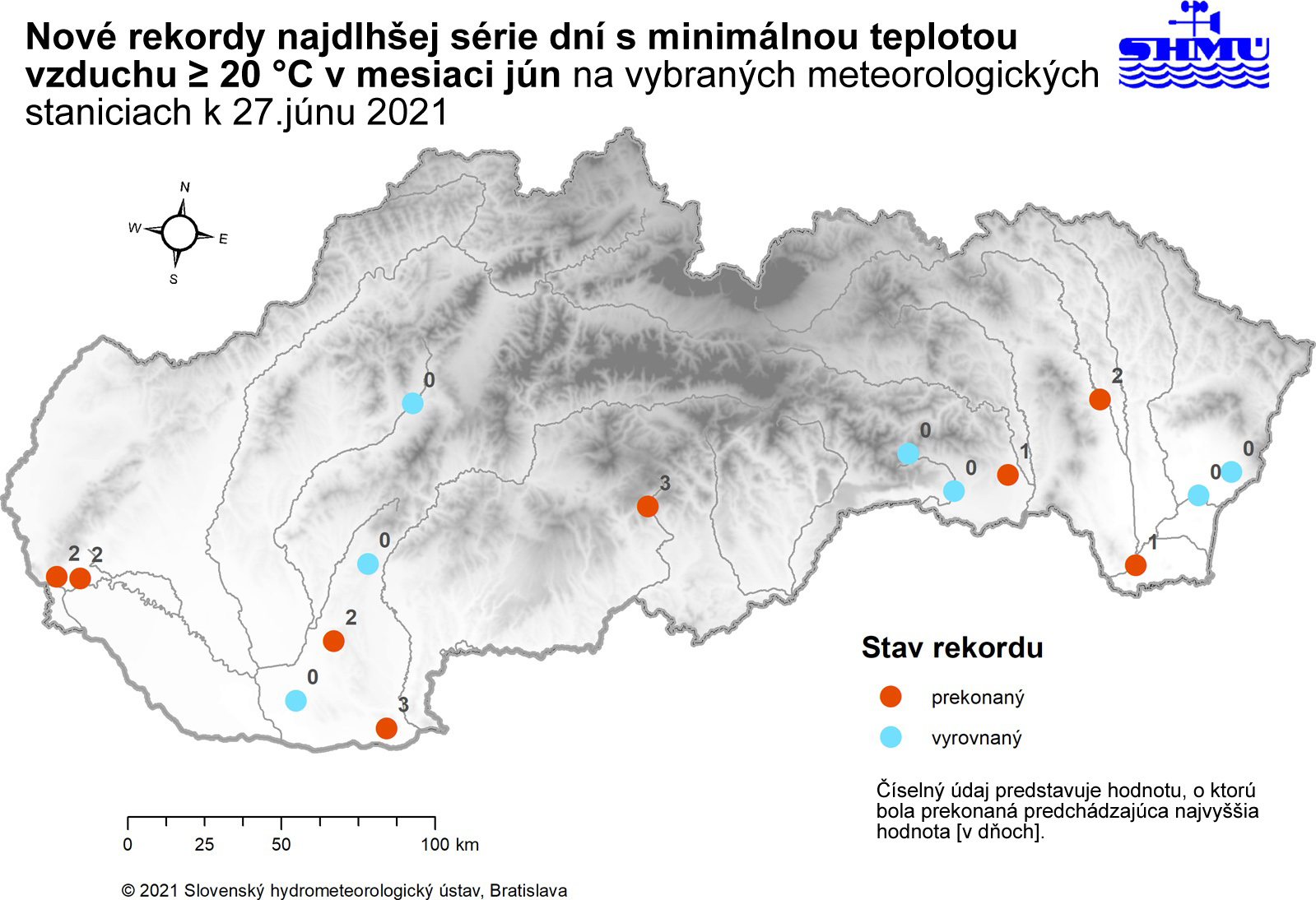 ▲ Obr. 4: Rekordy najdlhšej série (trvanie minimálne 2 dni) dní s minimálnou teplotou vzduchu ≥ 20 °C v mesiaci jún, zaznamenané počas prvej vlny horúčav v roku 2021 na meteorologických staniciach na Slovensku do 27. júna 2021 vrátane.