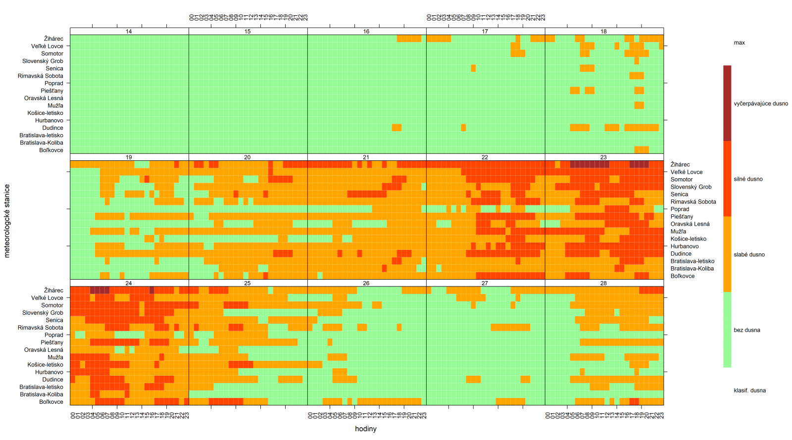 ▲ Obr. 7: Výskyt dusna (kategorizované) na vybraných meteorologických staniciach na Slovensku v období 14. – 28. juna 2021 v hodinovom intervale.
