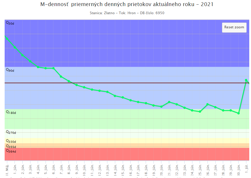 * Poznámka: M-denný prietok predstavuje priemerný denný prietok dosiahnutý alebo prekročený po M dní v zvolenom období. To znamená, že napríklad 355-denný prietok (Q355d) je hodnota, ktorá by v danom profile na toku mala byť menšia v priemere len 10 dní v roku (365 dní mínus 355), po zvyšné dni roka by mala byť buď rovná tejto hodnote alebo väčšia. Za hodnoty blízke minimám (obdobie sucha) považujeme najmä hodnoty odpovedajúce Q355d, Q364d.