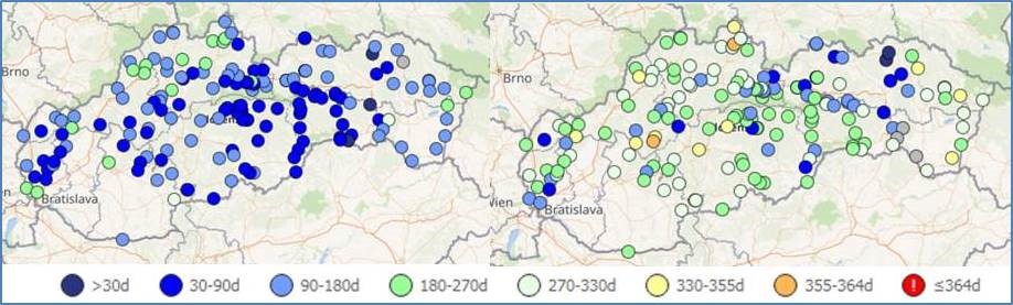 Z hľadiska dopĺňania podzemnej vody priaznivá klimatická situácia, hlavne z hľadiska zrážkovej činnosti v mesiaci máj (teplotne podnormálny až silne podnormálny a zrážkovo silne nadnormálny,viď predošlý článok TU, došlo v júni k radikálnej zmene klimatických podmienok, čo sa postupne začalo prejavovať aj v podzemenj vode. Od začiatku júna bola priemerná denná teplota vzduchu vyššia ako dlhodobý priemer rokov 1981 – 2010. Výraznejšie to bolo na juhozápade Slovenska, v porovnaní s východom územia. Okrem toho, že v júni bolo výrazne teplo, bolo aj pomerne sucho, pretože zrážky, ktoré v prvých dňoch júna spadli (a bolo ich málo) nedokázali vykompenzovať vysoký výpar v tomto období a zároveň nedokázali dopĺňať zásoby podzemej vody. Na začiatku júna bola situácia v podzemnej vode ešte priaznivá (obr. 4), s prevahou výskytu mierne nadpriemernej a nadpriemernej hladiny podzemnej vody a výdatností prameňov v rámci celého územia Slovenska (modrá farba), postupne však dochádzalo k poklesom hladiny podzemnej vody a výdatností prameňov. Výraznejší pokles hladiny podzemnej vody a výdatností prameňov sa prejavil od polovice druhej dekády mesiaca (obr. 5) a pretrvával až do konca mesiaca (obr. 6). Hladina podzemnej vody a výdatnosť prameňov výrazne nižšie ako je dlhodobý normál referenčného obdobia sa prejavila v 18 % hodnotených objektov v rámci celého územia Slovenska (červená farba), najviac týchto objektov bolo v povodí Váhu a Bodgrogu. Hladina podzemnej vody a výdatnosť prameňov nižšia ako je dlhodobý normál referenčného obdobia sa vyskytla v 29 % hodnotených objektov (oranžová farba) v rámci celého územia Slovenska, ale najpočetnejšiev povodí Váhu, Hrona, Bodrogu a Slanej.