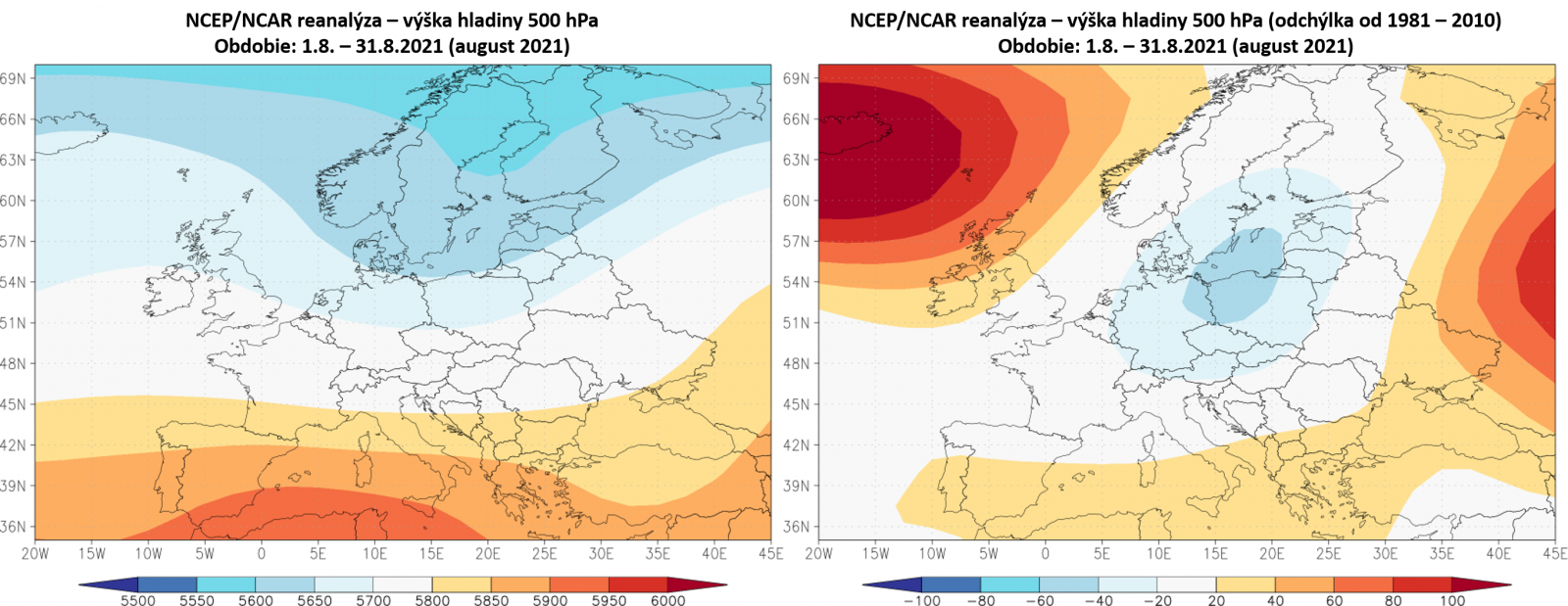 ▲ Obr. 1: Reanalýza priemernej výšky hladiny 500 hPa (vľavo - absolútne hodnoty; vpravo - odchýlka od normálu 1981 - 2010) v období 1.8. - 31.8.2021 (zdroj: NCEP/NCAR).