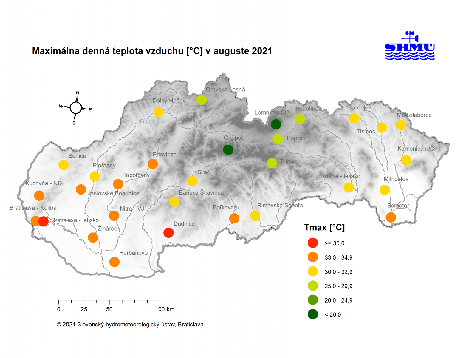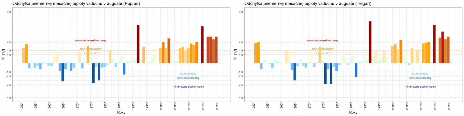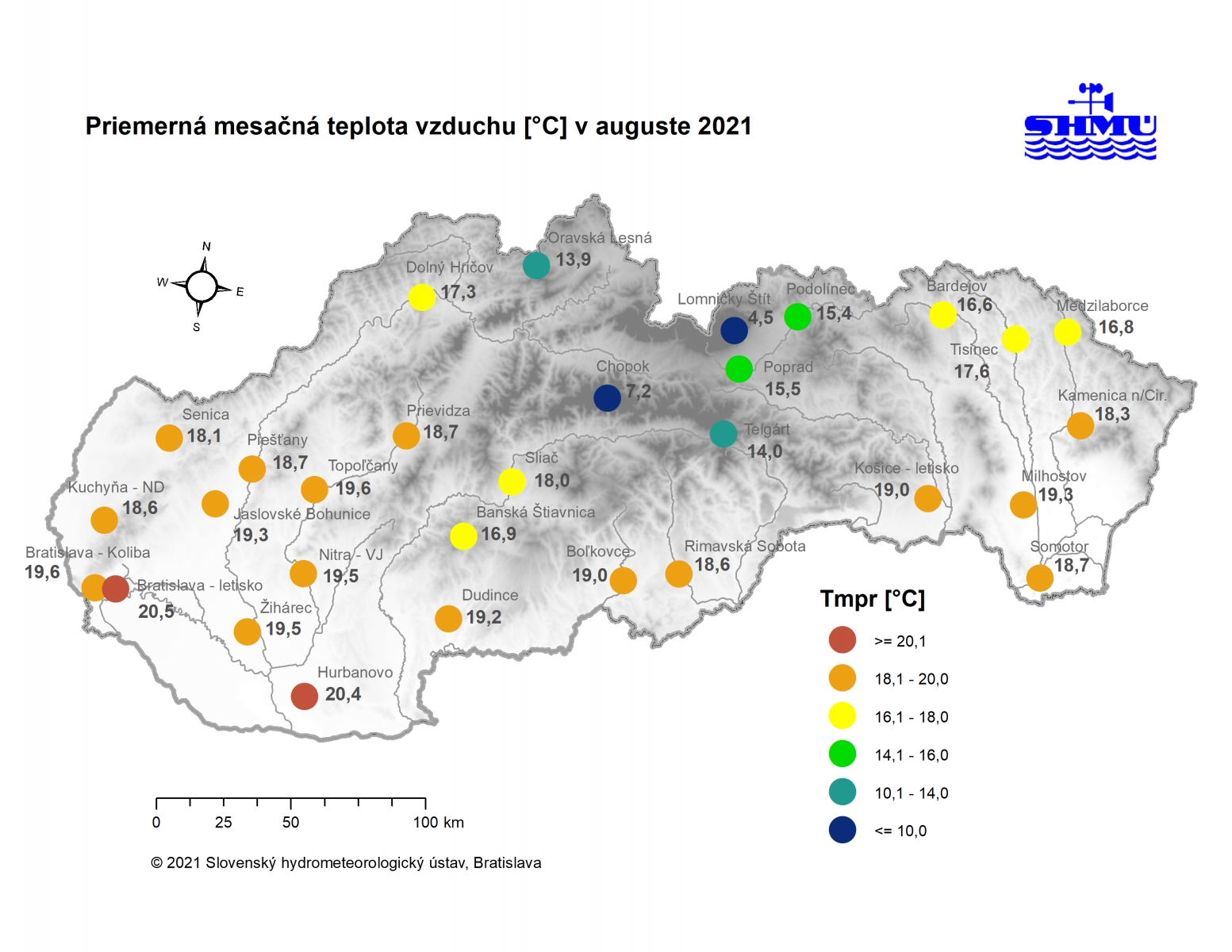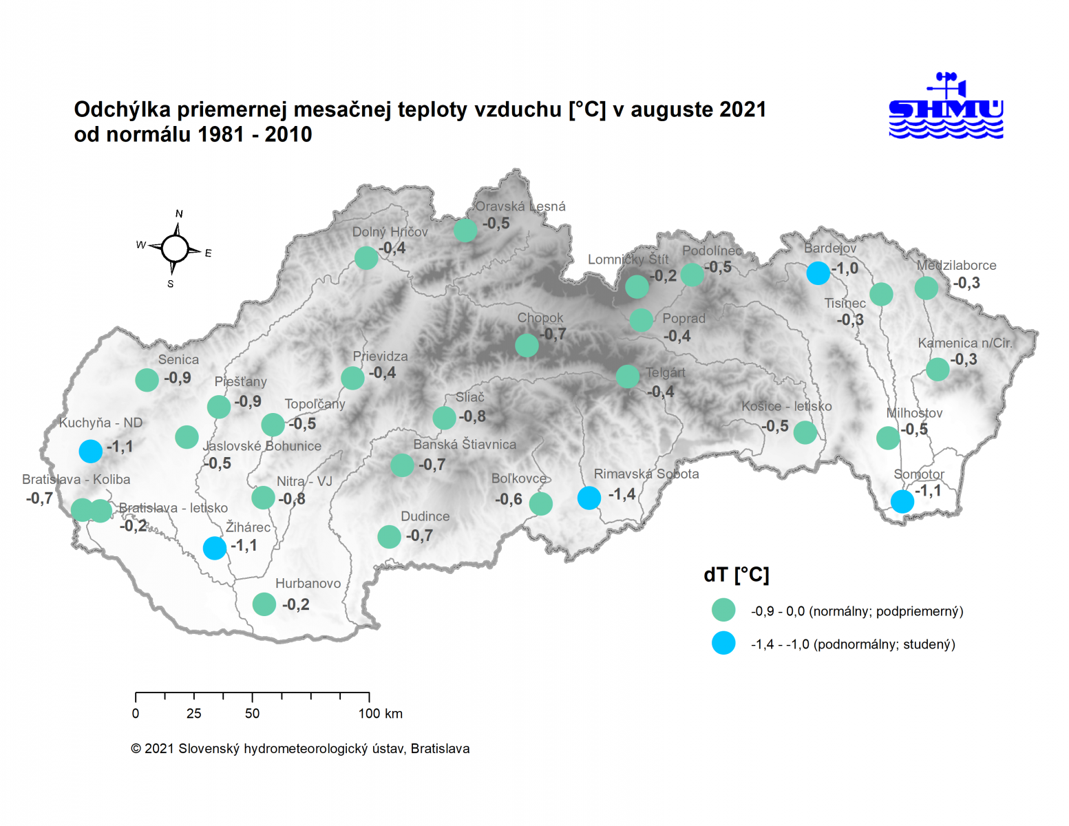 V dôsledku výrazne chladnejšieho a premenlivejšieho charakteru počasia v druhej polovici mesiaca bol august 2021 na väčšine územia Slovenska teplotne normálny (so zápornou odchýlkou od normálu), lokálne až podnormálny (studený). Odchýlka priemernej mesačnej teploty vzduchu v porovnaní s normálom 1981 – 2010 bola v auguste prevažne v intervale od -0,4 do -0,9 °C, relatívne teplejšie bolo napríklad na meteorologických staniciach Bratislava-letisko (-0,2 °C), Hurbanovo (-0,2 °C), Lomnický štít (-0,2 °C), Kamenica nad Cirochou (-0,3 °C) a Medzilaborce (-0,3 °C). Naopak relatívne chladnejšie bolo na staniciach Kuchyňa (-1,1 °C), Žihárec (-1,1 °C), Somotor (-1,1 °C) a Bardejov (-1,0 °C) – v uvedených lokalitách skončil uplynulý mesiac ako studený.