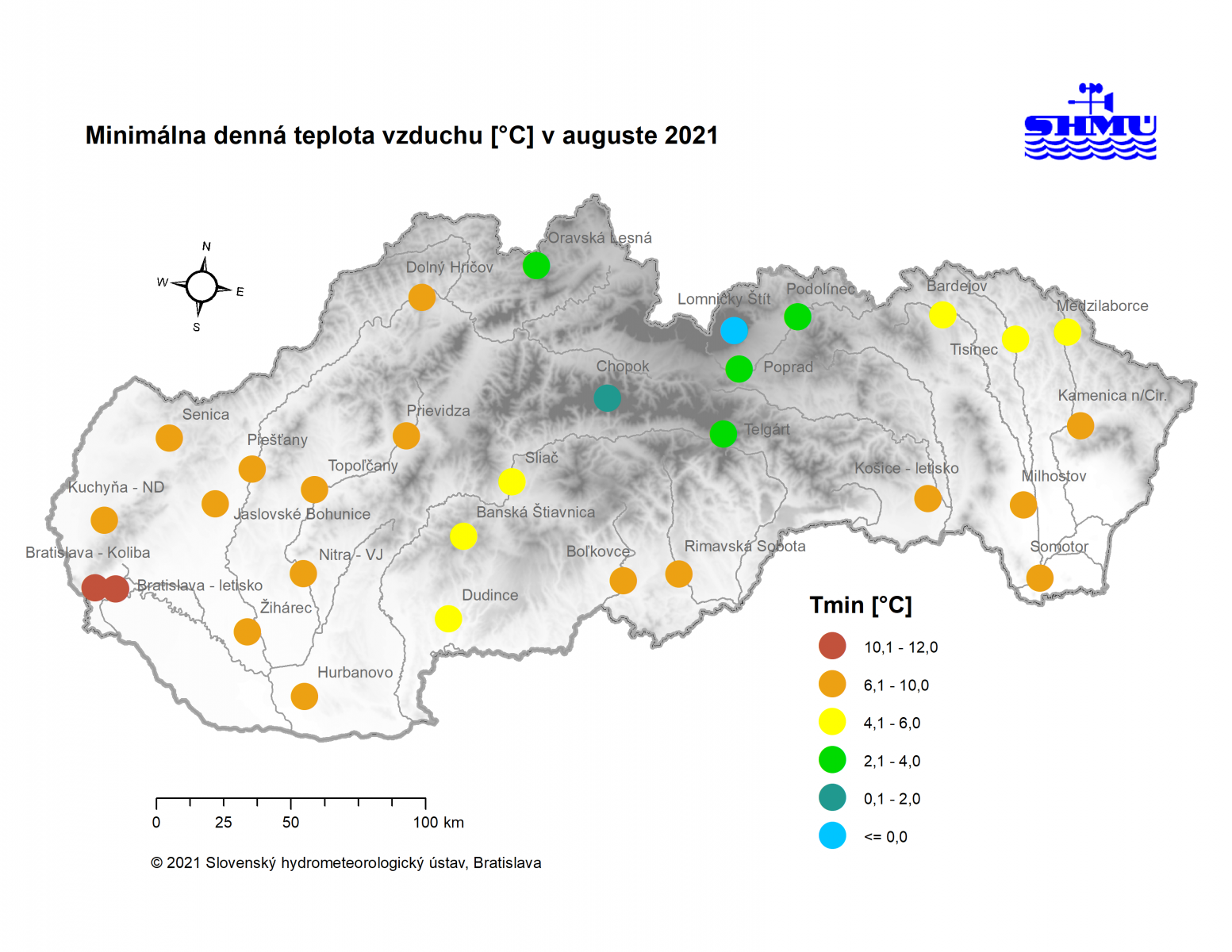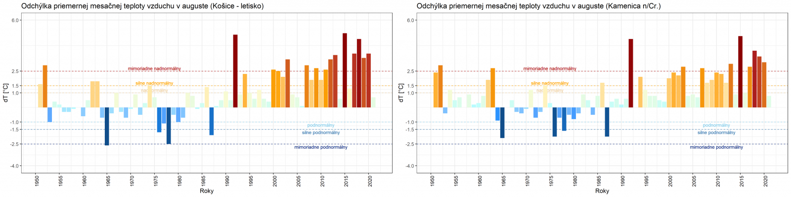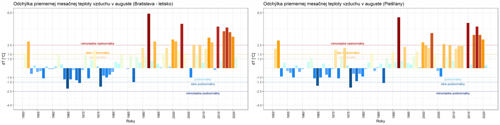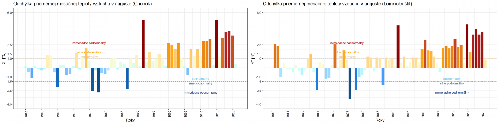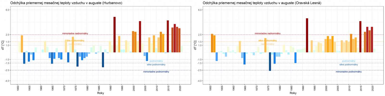 V dôsledku výrazne chladnejšieho a premenlivejšieho charakteru počasia v druhej polovici mesiaca bol august 2021 na väčšine územia Slovenska teplotne normálny (so zápornou odchýlkou od normálu), lokálne až podnormálny (studený). Odchýlka priemernej mesačnej teploty vzduchu v porovnaní s normálom 1981 – 2010 bola v auguste prevažne v intervale od -0,4 do -0,9 °C, relatívne teplejšie bolo napríklad na meteorologických staniciach Bratislava-letisko (-0,2 °C), Hurbanovo (-0,2 °C), Lomnický štít (-0,2 °C), Kamenica nad Cirochou (-0,3 °C) a Medzilaborce (-0,3 °C). Naopak relatívne chladnejšie bolo na staniciach Kuchyňa (-1,1 °C), Žihárec (-1,1 °C), Somotor (-1,1 °C) a Bardejov (-1,0 °C) – v uvedených lokalitách skončil uplynulý mesiac ako studený.