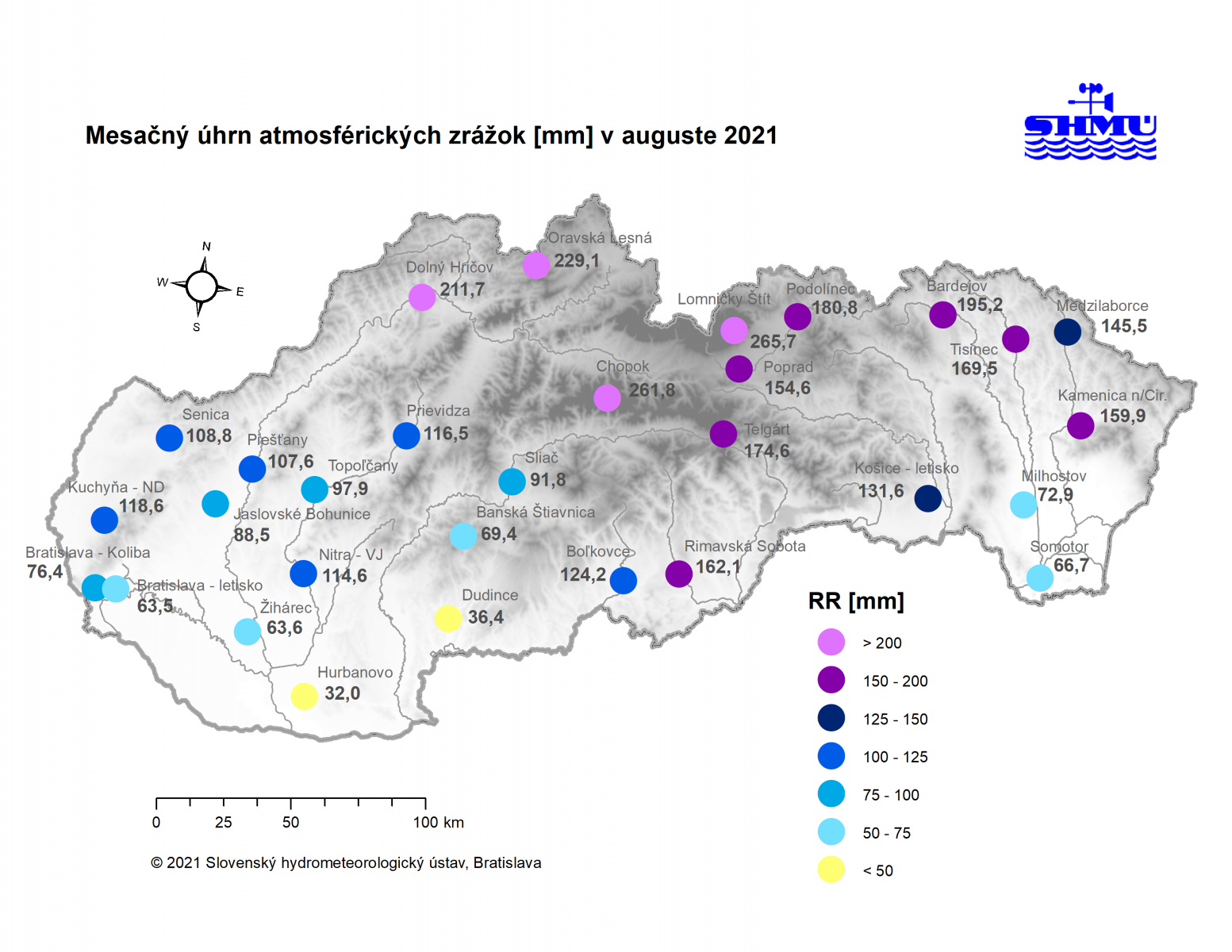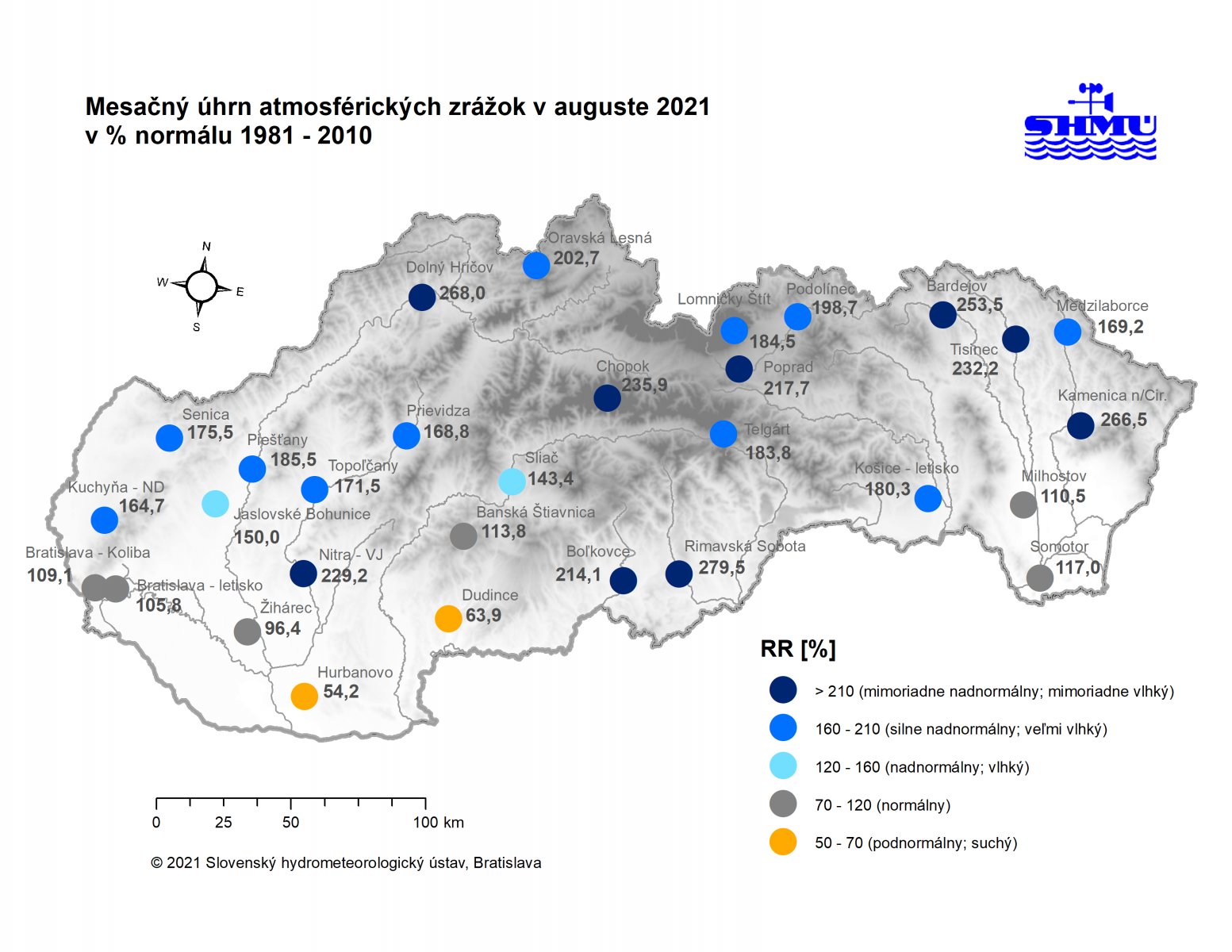 Atmosférické zrážky sa v priebehu augusta vyskytovali na území Slovenska pomerne pravidelne, najmä však v období prvej augustovej pentády (1.-5.8.), potom dňa 16.8. a počas poslednej dekády (22.-31.8.). Predovšetkým v dňoch 5.8., 16.8., 29.8. a 31.8. boli na viacerých meteorologických staniciach namerané denné úhrny zrážok aj viac ako 50 mm. August 2021 bol tak na viacerých miestach Slovenska mimoriadne až extrémne bohatý na atmosférické zrážky. V porovnaní s normálom 1981 – 2010 bol uplynulý mesiac zrážkovo prevažne silne (veľmi vlhký) až mimoriadne nadnormálny (mimoriadne vlhký), výnimkou boli len niektoré regióny na juhu západného a východného Slovenska, kde bol mesiac zrážkovo normálny, miestami až suchý (podnormálny; napr. Hurbanovo 54,2 % normálu alebo Dudince 63,9 % normálu).