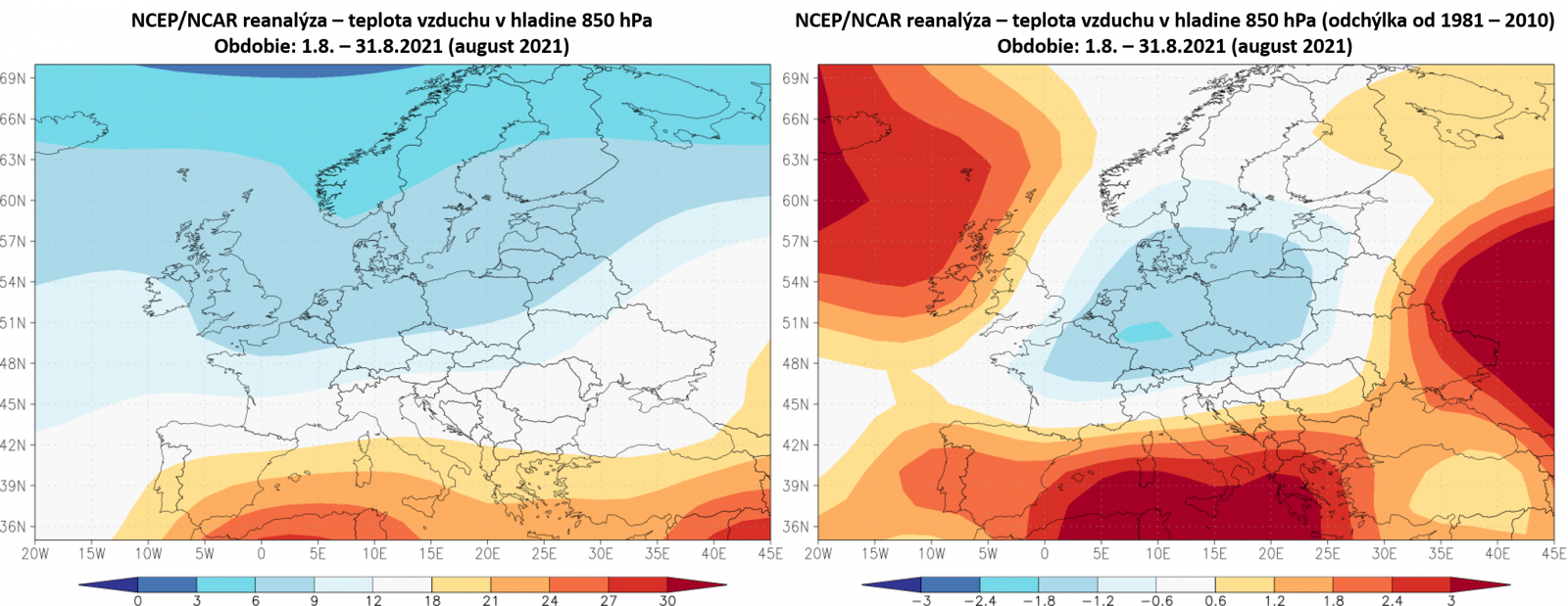 ▲ Obr. 2: Reanalýza priemernej teploty vzduchu v hladine 850 hPa (vľavo - absolútne hodnoty; vpravo - odchýlka od normálu 1981 - 2010) v období 1.8. - 31.8.2021 (zdroj: NCEP/NCAR).