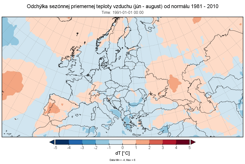 ▲ Obr. 6: (vľavo) Odchýlka priemernej sezónnej teploty vzduchu [°C] v Európe v období mesiacov jún - august od normálu 1981 - 2010 za obdobie rokov 1991 - 2021 podľa údajov globálnej reanalýzy ERA5; (vpravo) to isté pre sezónny úhrn atmosférických zrážok vyjadrený v abs. rozdieloch od normálu 1981 - 2010 (zdroj: ECMWF).